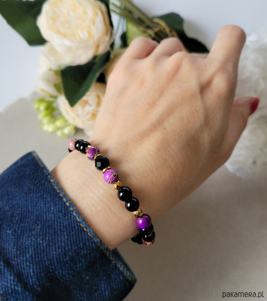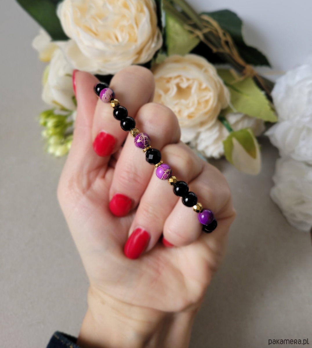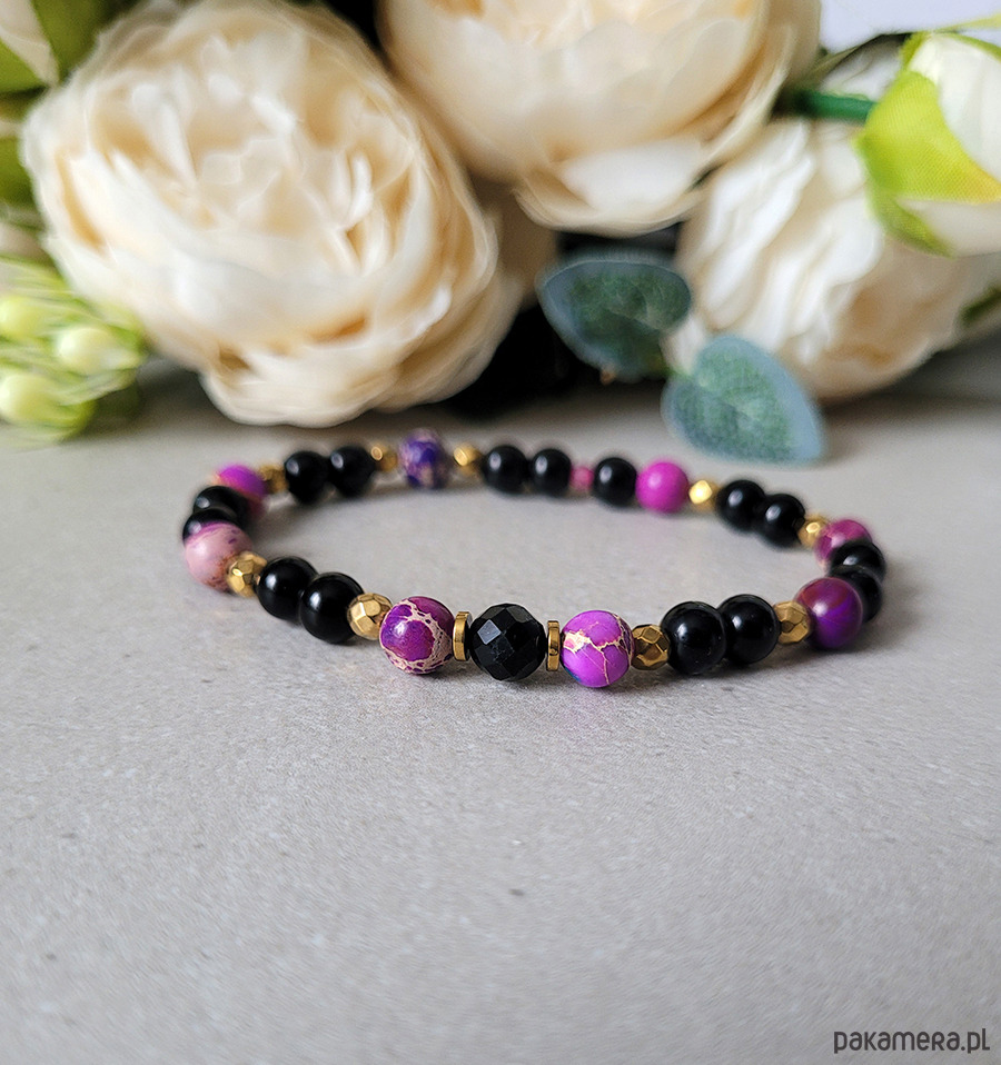 Piękna elegancka bransoletka zrobiona z kamieni naturalnych: Turmalinu, Jaspisu Cesarskiego, Onyksu oraz Hematytu w kolorze złota. Całość uzupełniona malutkimi Cyrkoniami o śr. ok. 3mm.