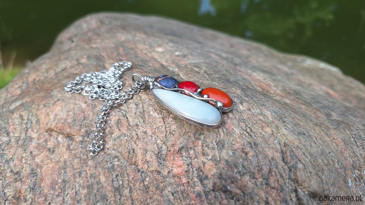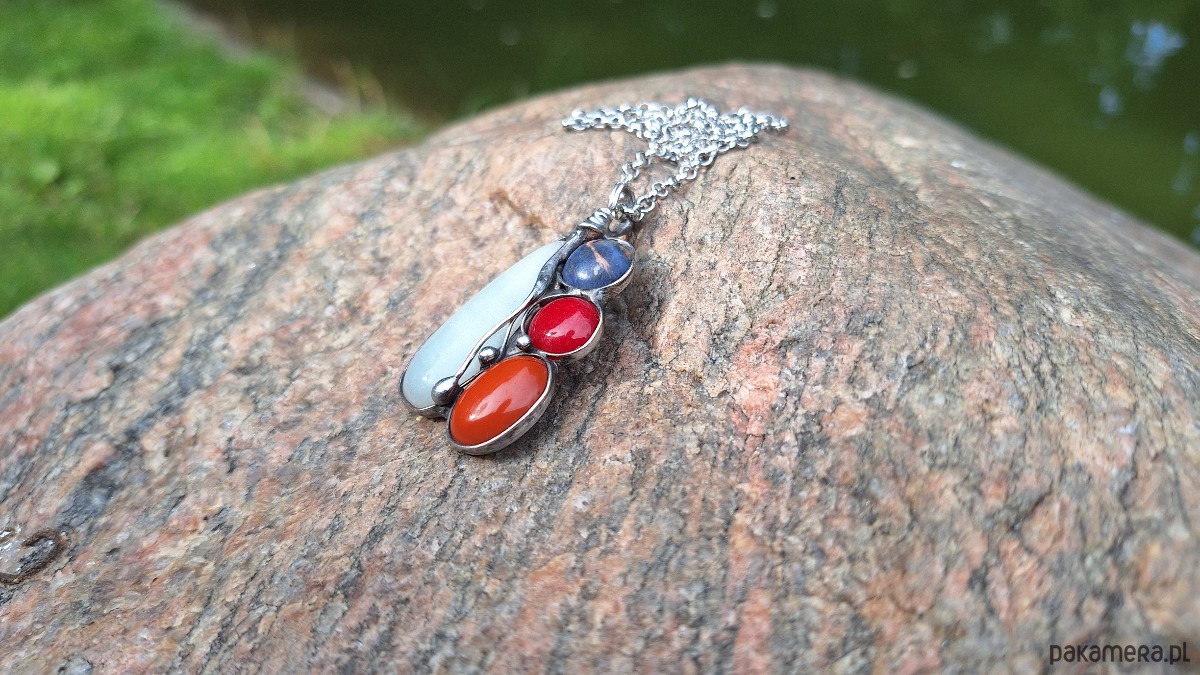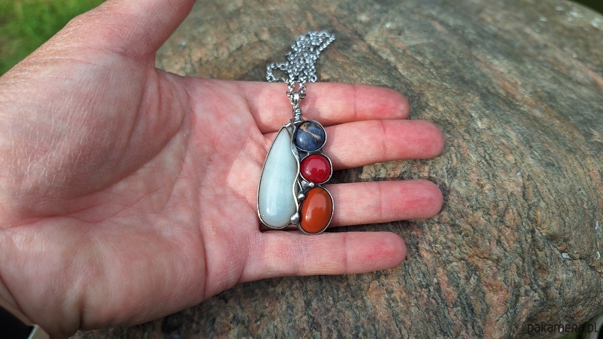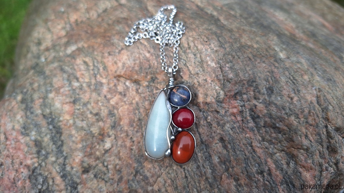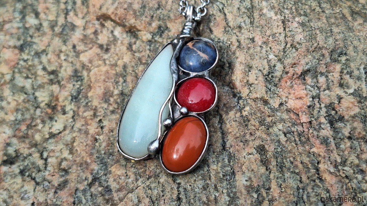 Wisiorek wykonany z miedzi, cyny, jaspisu, jadeitu, sodalitu i amazonitu. Wymiary ok. 4.5 na 2.5 cm. Zawieszony na łańcuszku o długości ok. 50 cm.