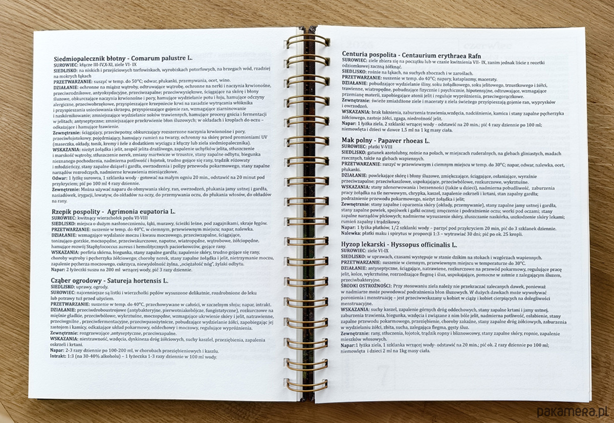 opis każdej rośliny: miejsce występowania, zasady zbioru i przetwarzania, przepisy na wykorzystanie, wskazania i działanie, właściwości lecznicze i sposób użycia każdej rośliny, przepisy na napary, nalewki, kąpiele, maści, soki, a także zastosowanie kulinarne