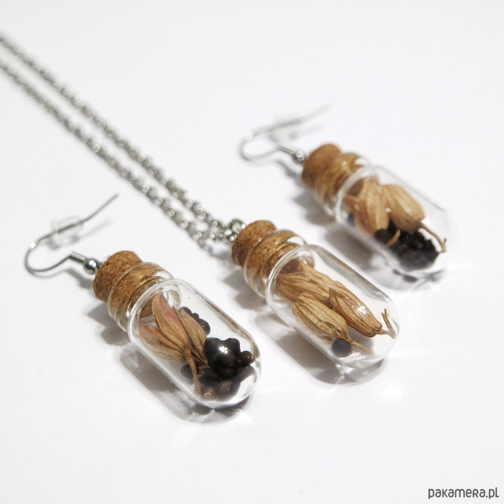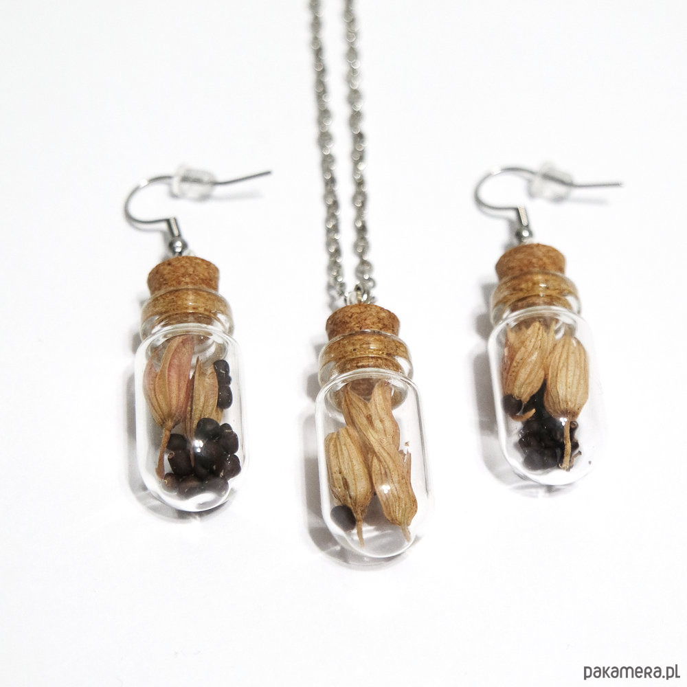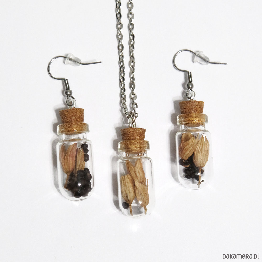 Długość kolczyków 5 cm, fiolki zawieszone są na solidnych biglach otwartych ze stali szlachetnej i zabezpieczone silikonowymi zatyczkami.