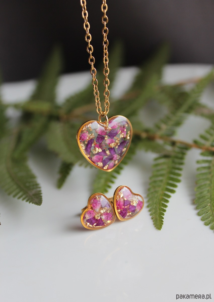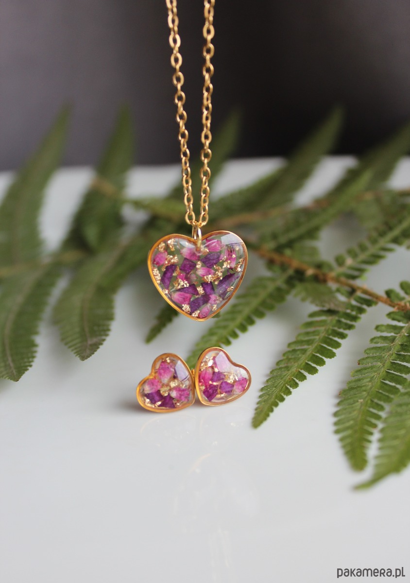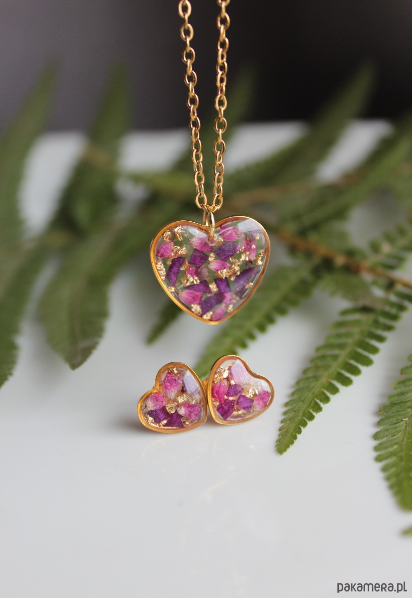 Prawdziwe kwiaty złoty komplet serca serduszka storczyk wrzosiec