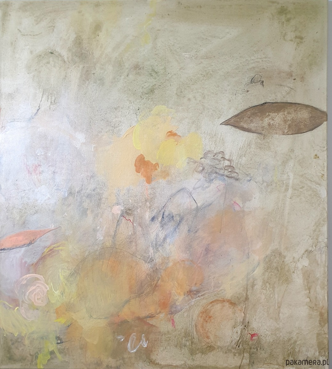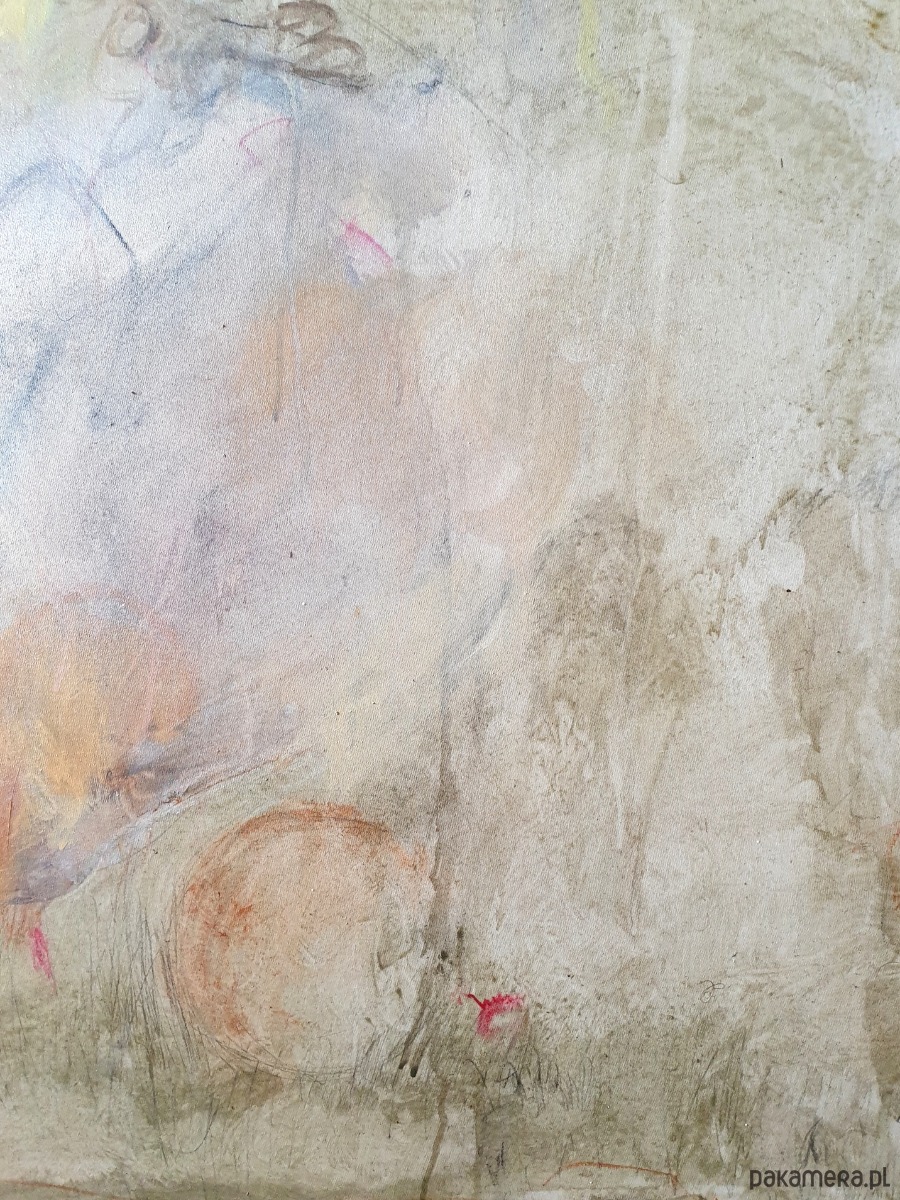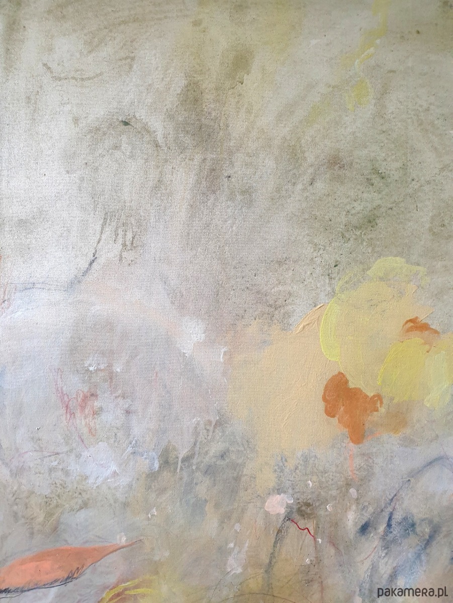 TECHNIKA I WYMIARY: Pigmenty ziemne, akryl, papier, węgiel, pastele, ołówek na płótnie bawełnianym, 80x90 cm