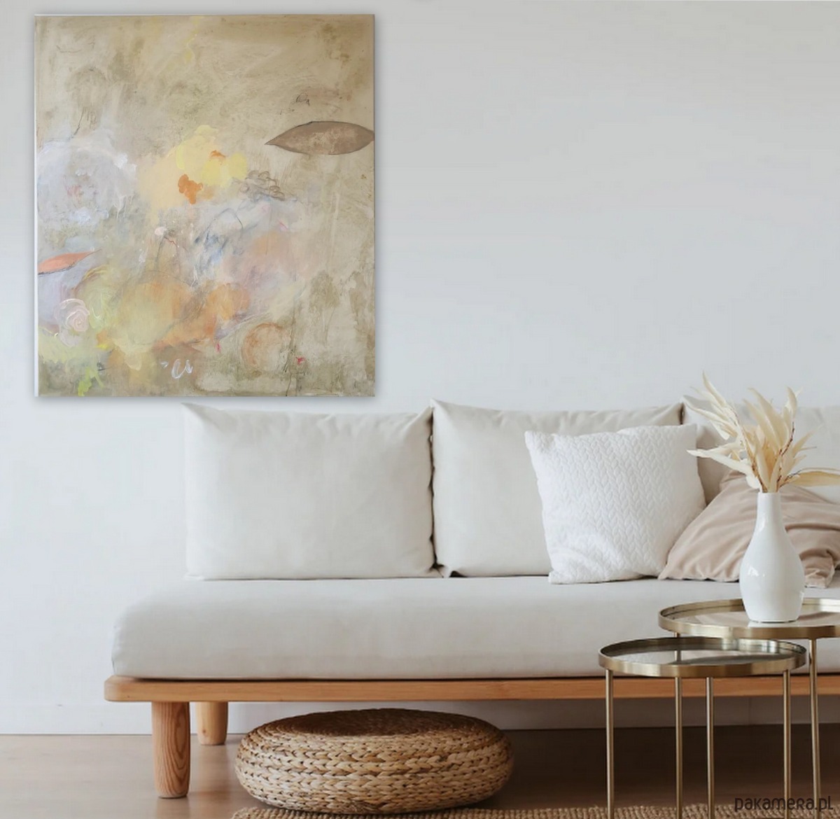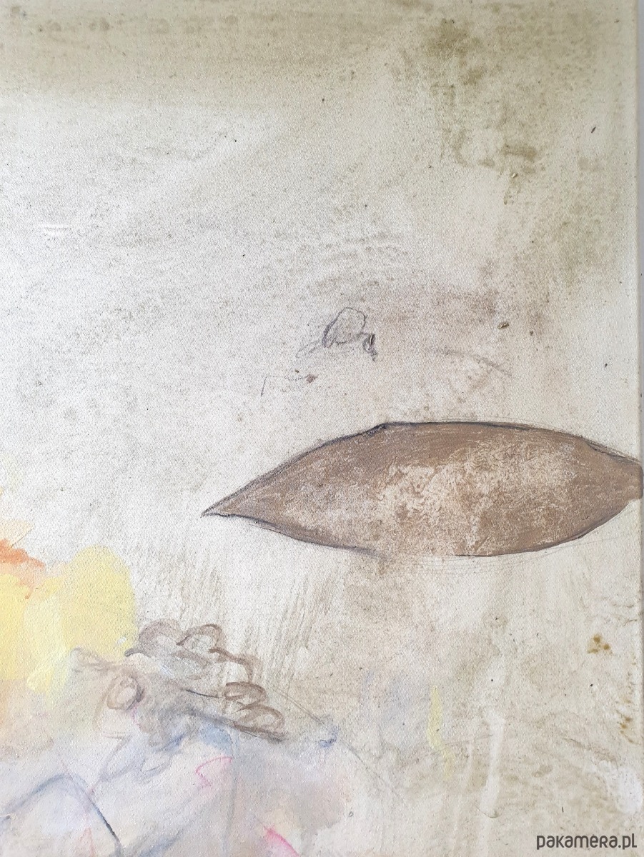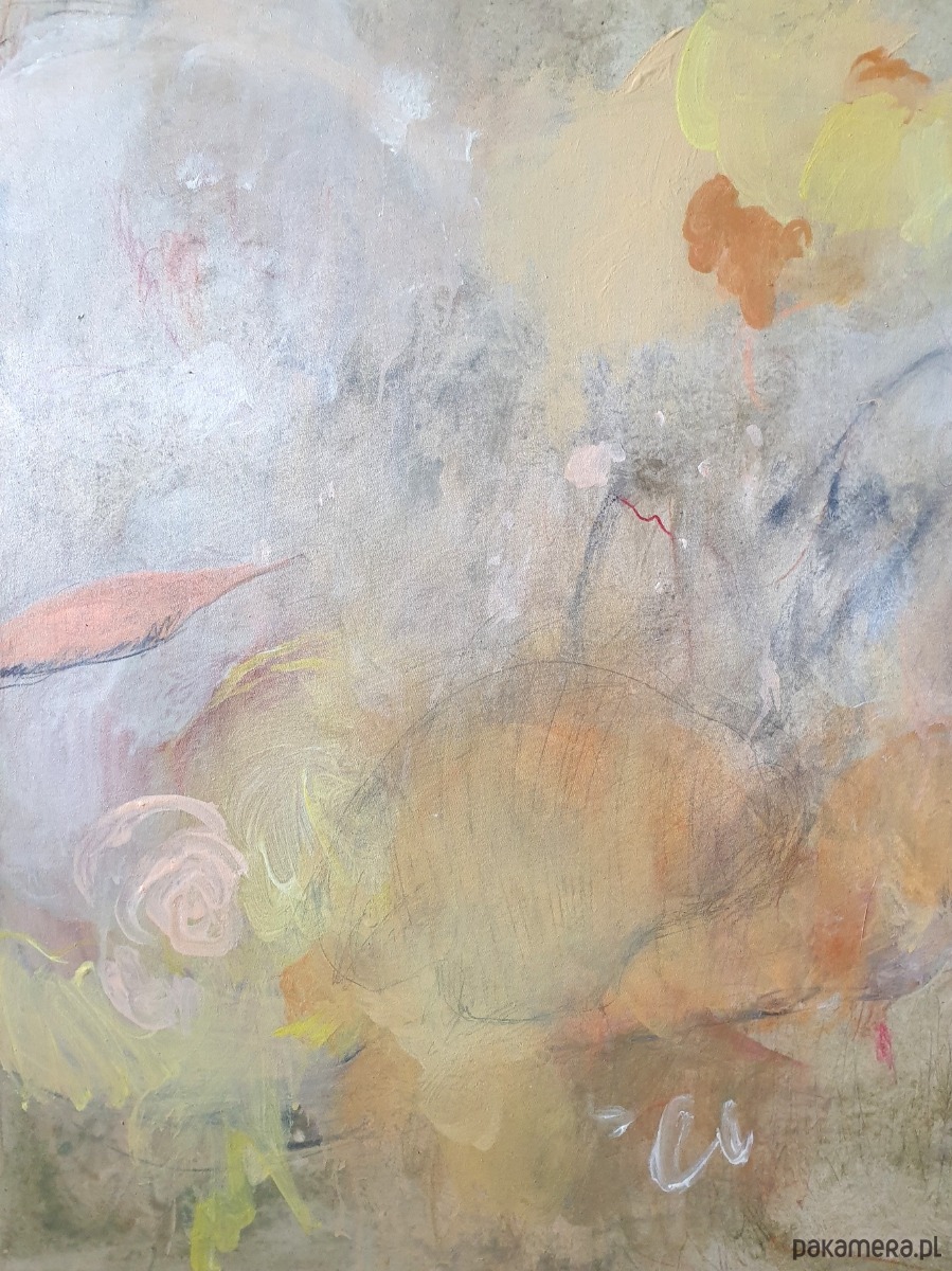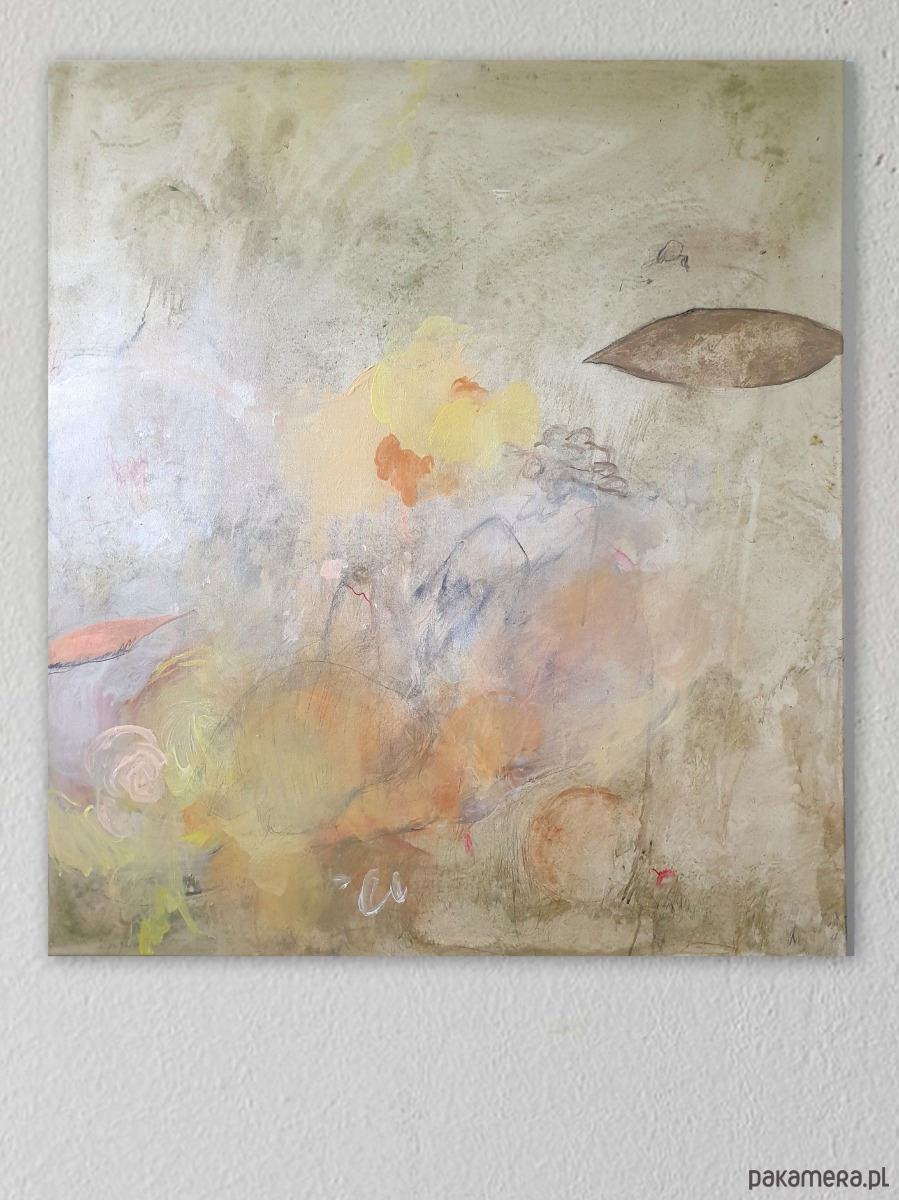 TECHNIKA I WYMIARY: Pigmenty ziemne, akryl, papier, węgiel, pastele, ołówek na płótnie bawełnianym, 80x90 cm