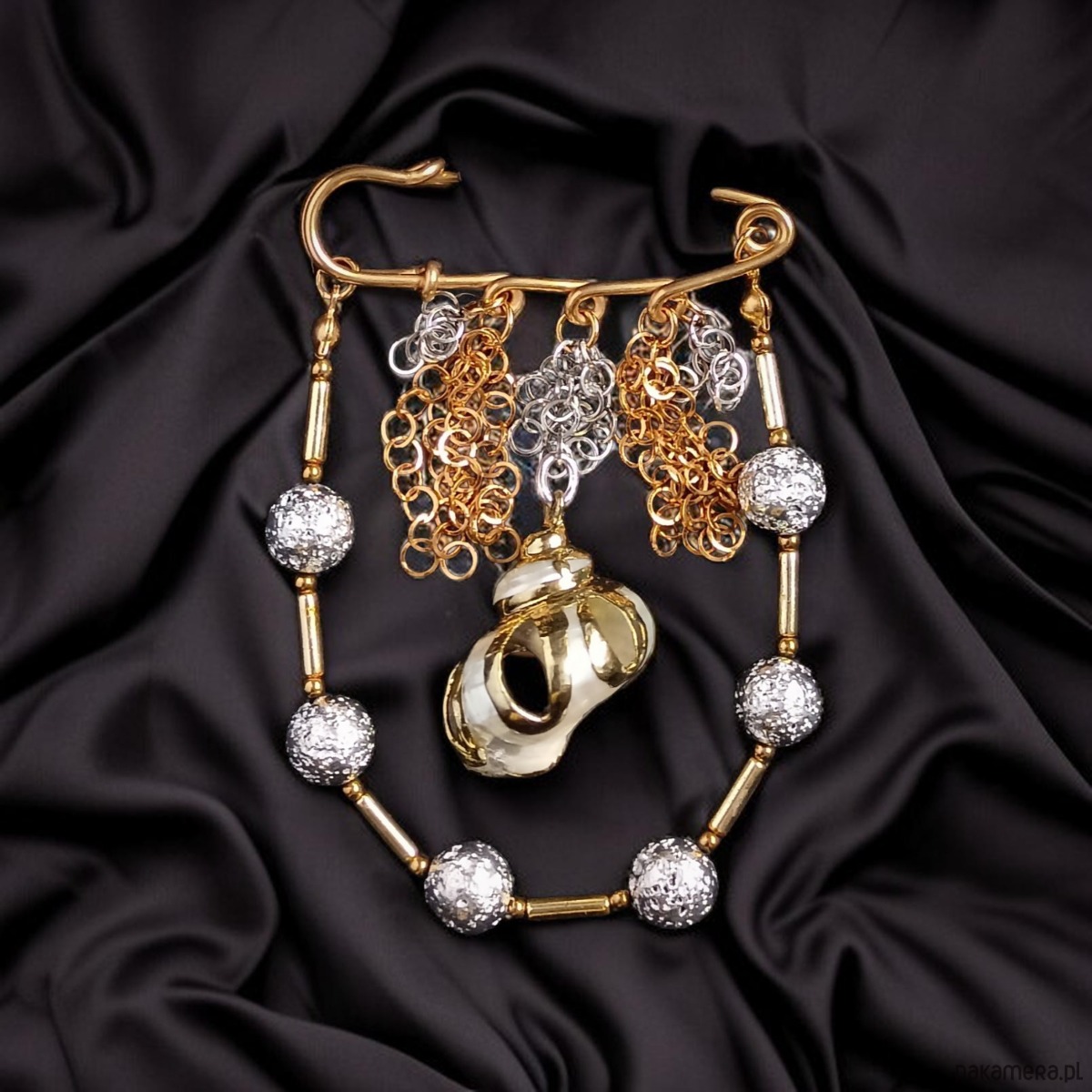 PREMIUM : broszka srebrno-złota z muszlą : efektowna, okazała