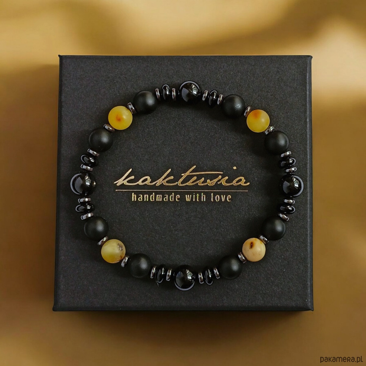 wykonana z matowego bursztynu bałtyckiego 8mm, onyksu mat 8mm, plasterków onyksu, czarnego turmalinu (połysk, 8mm), licznych przekładek z grafitowego hematytu.