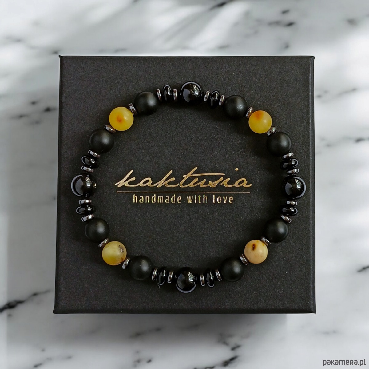 wykonana z matowego bursztynu bałtyckiego 8mm, onyksu mat 8mm, plasterków onyksu, czarnego turmalinu (połysk, 8mm), licznych przekładek z grafitowego hematytu.