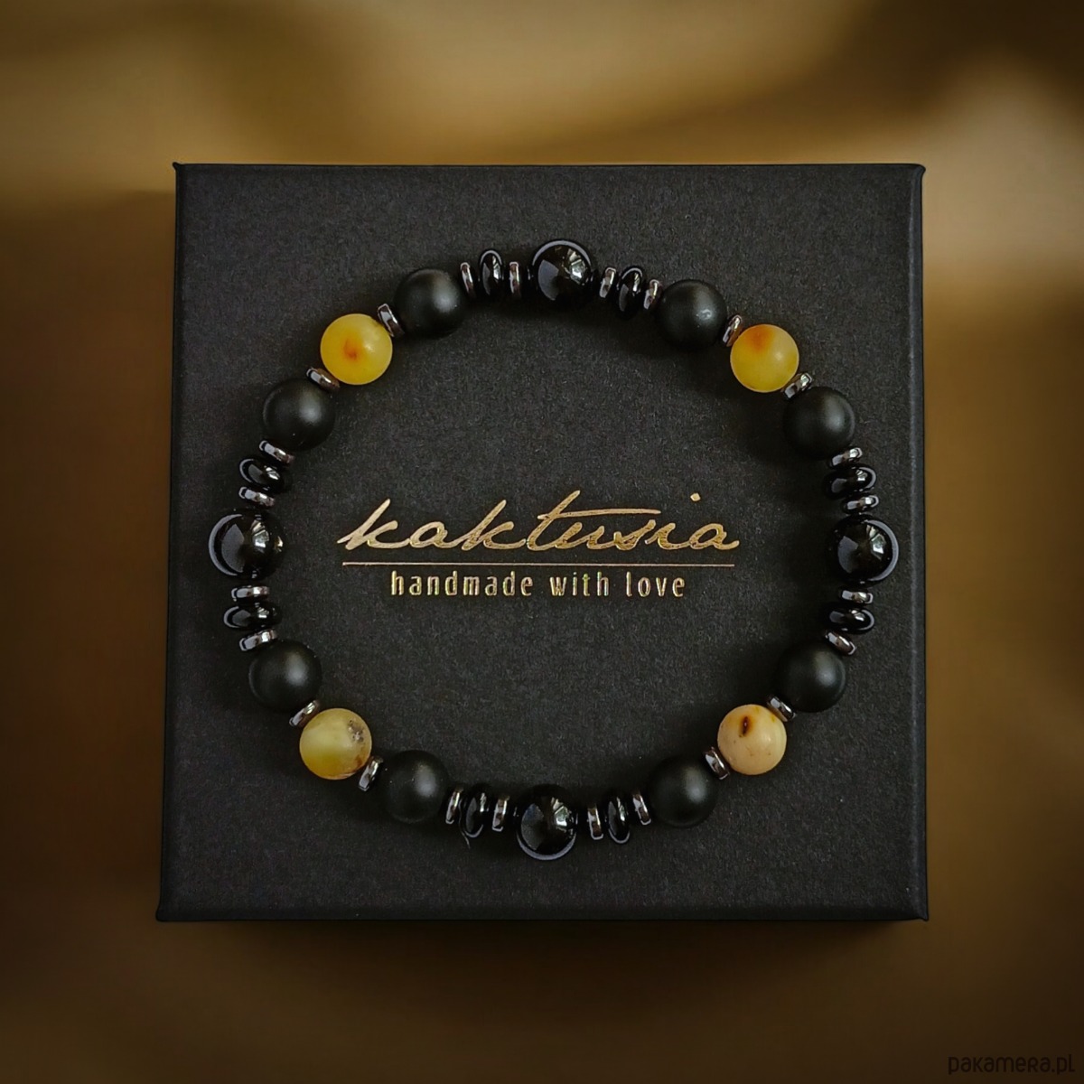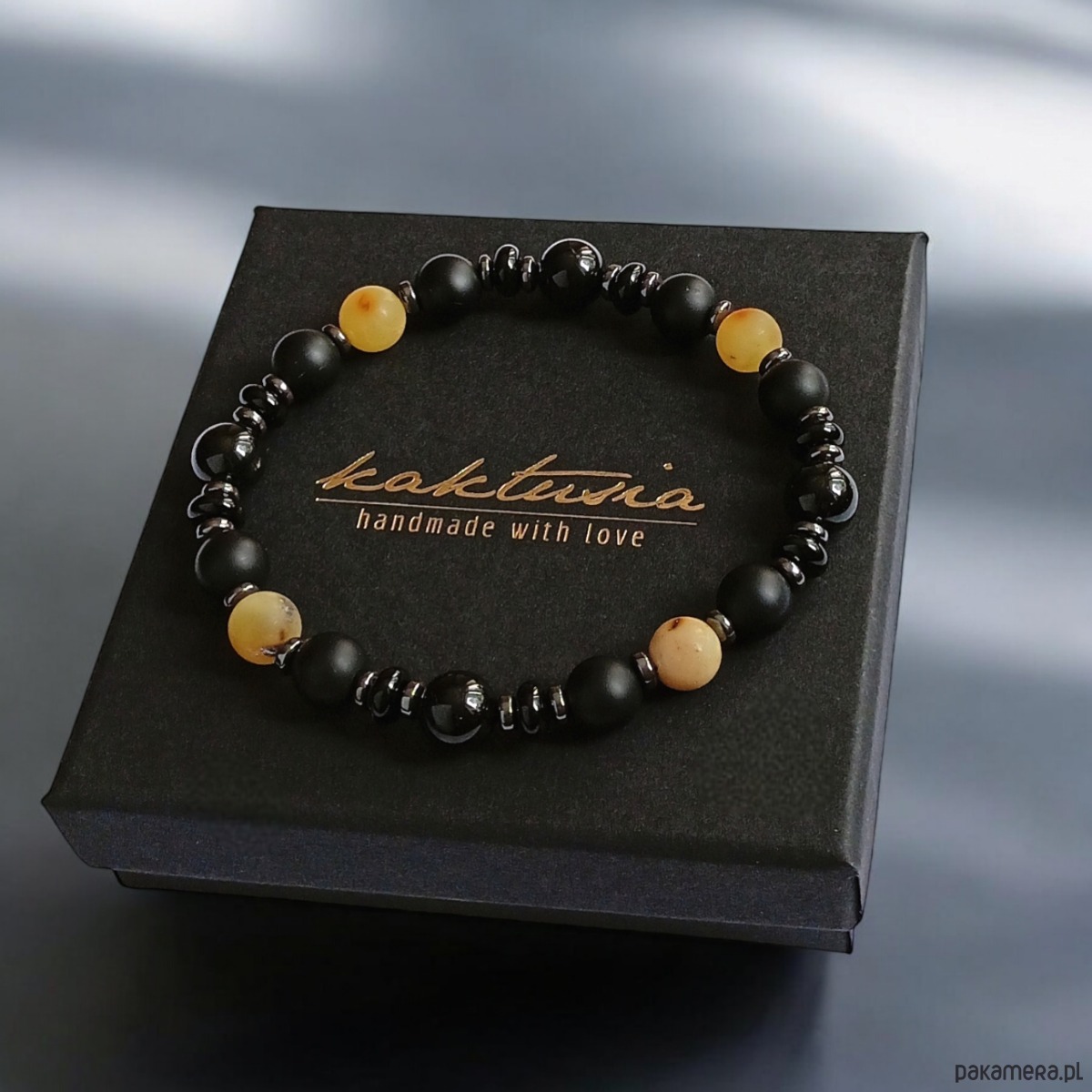 wykonana z matowego bursztynu bałtyckiego 8mm, onyksu mat 8mm, plasterków onyksu, czarnego turmalinu (połysk, 8mm), licznych przekładek z grafitowego hematytu.