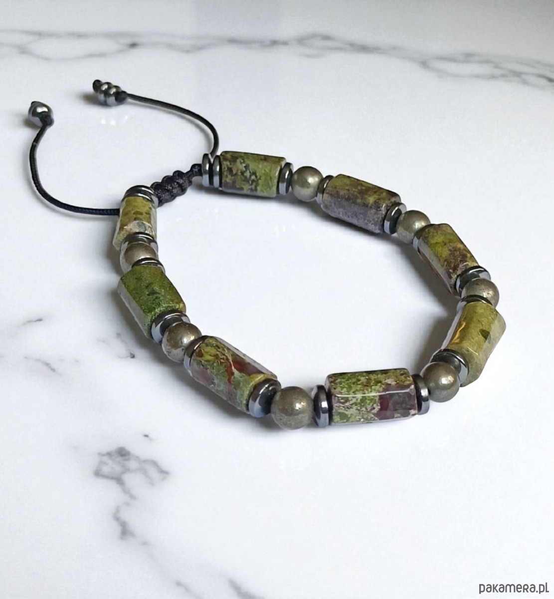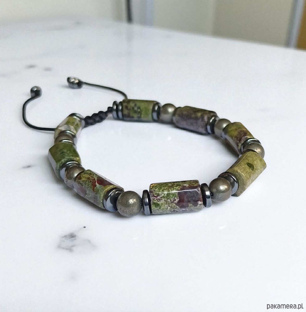 wykonana z polerowanych, ciosanych, nieregularnych bryłek niezwykłego minerału JASPIS SMOCZA KREW (przekrój ok.8mm) - w odcieniach zieleni, z bordowymi wtrąceniami, pirytu- kule błysk (6mm), przekładek z hematytu.
