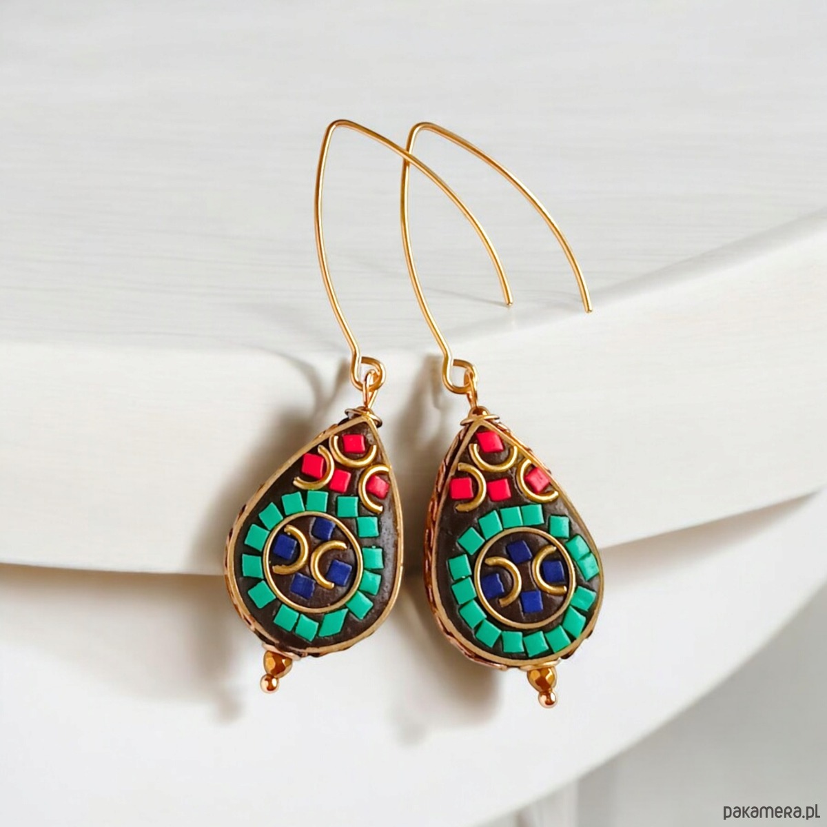 Zjawiskowe, niezwykle efektowne kolczyki w stylu etno - wykonane z RĘCZNIE ROBIONYCH korali tybetańskich z inkrustowanym koralem, turkusem i lapis lazuli (baza: mosiądz) oraz przekładek ze złotego hematytu i elementów metalowych z pozłacanej stali szlachetnej (nie uczula).