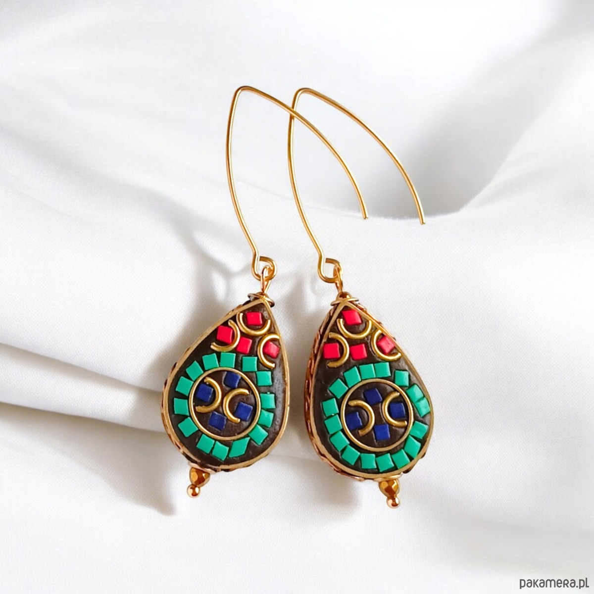 Zjawiskowe, niezwykle efektowne kolczyki w stylu etno - wykonane z RĘCZNIE ROBIONYCH korali tybetańskich z inkrustowanym koralem, turkusem i lapis lazuli (baza: mosiądz) oraz przekładek ze złotego hematytu i elementów metalowych z pozłacanej stali szlachetnej (nie uczula).