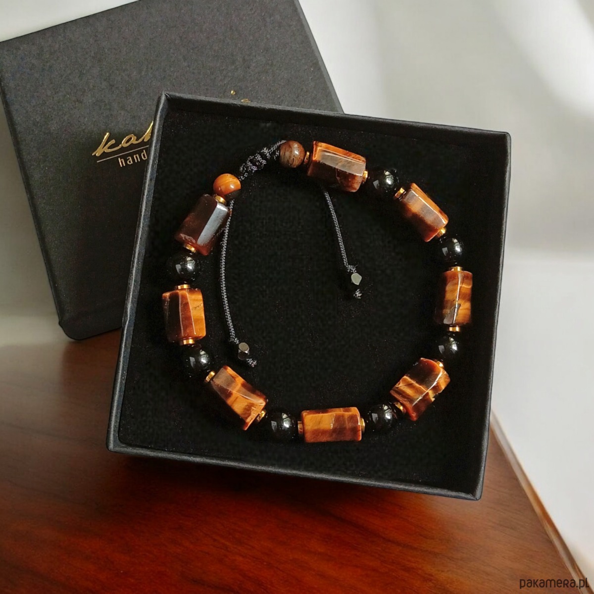 wykonana z polerowanych, ciosanych, nie regularnych bryłek tygrysiego oka (przekrój ok 10mm), czarnego turmalinu - kule błysk (8mm), delikatnych przekładek ze złotego hematytu.