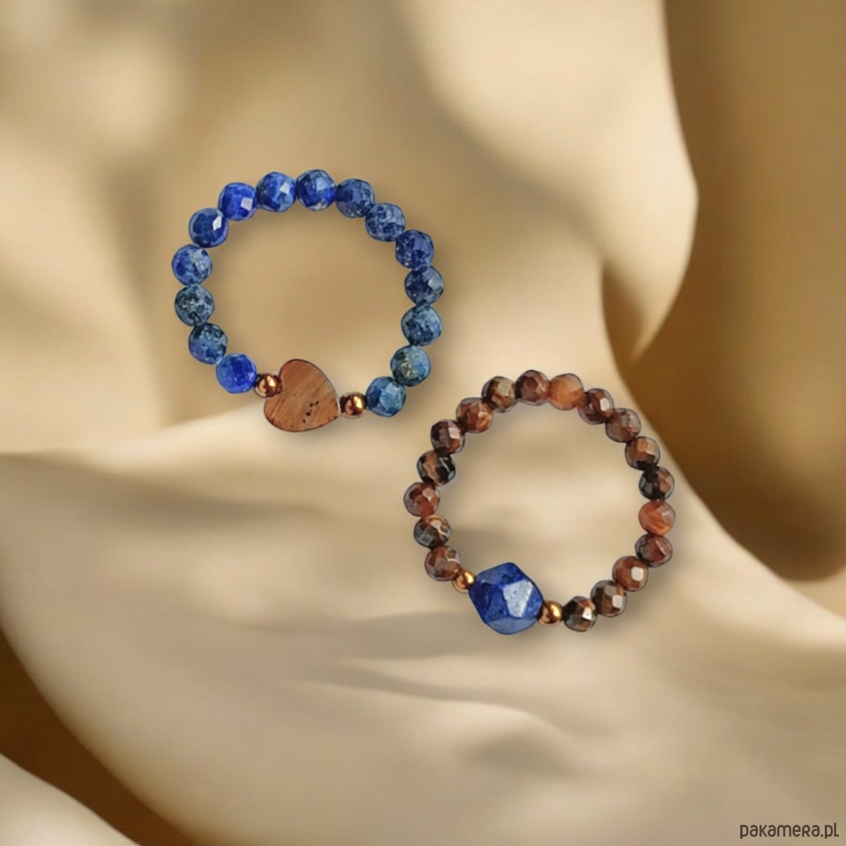 Pierścionki elastyczne zostały wykonane z kuleczek fasetowanego lapis lazuli (ok.3,3mm) oraz tygrysiego oka 3mm, serduszka z tygrysiego oka i fasetowanego lapis lazuli 6mm, a także z przekładek ze złotego hematytu.