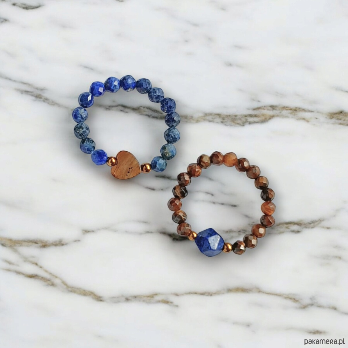 Pierścionki elastyczne zostały wykonane z kuleczek fasetowanego lapis lazuli (ok.3,3mm) oraz tygrysiego oka 3mm, serduszka z tygrysiego oka i fasetowanego lapis lazuli 6mm, a także z przekładek ze złotego hematytu.
