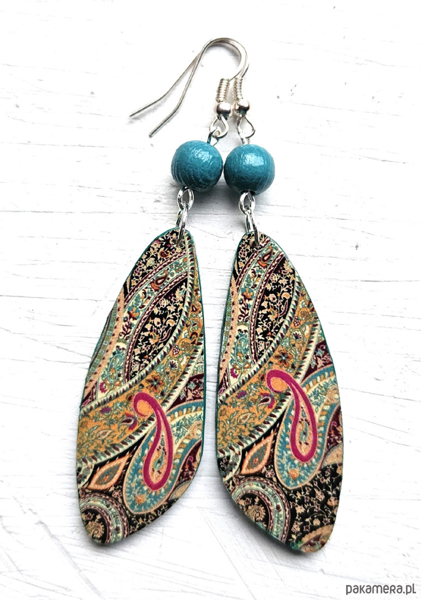 kolczyki drewniane, ozdobione metodą decoupage, dwustronne, starannie wykończone farbami akrylowymi i zabezpieczone wielokrotnie lakierem, bigle posrebrzane, długość kolczyków bez bigli: 6 cm, szerokość: 2 cm, bardzo lekkie