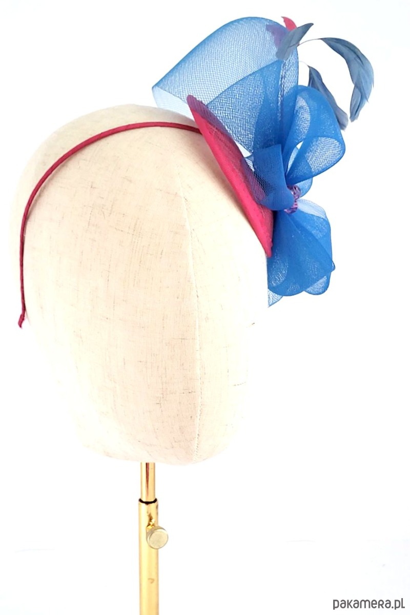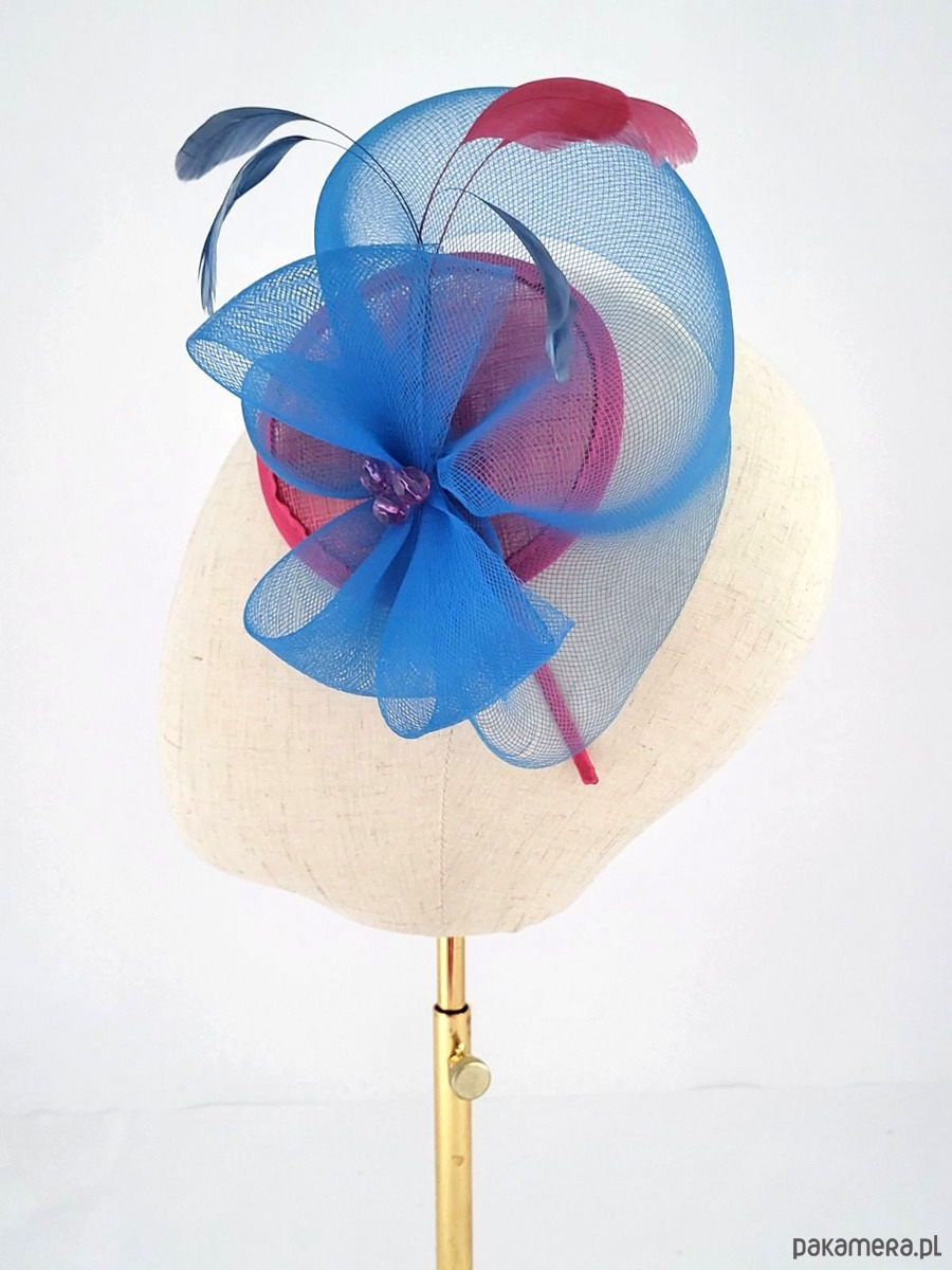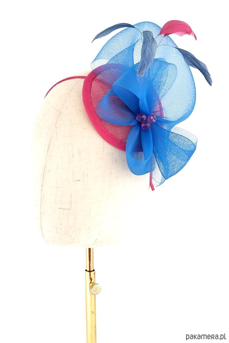 Mini toczek sinamay z kompozycją z krynoliny w kontrastowym ( ale pasującym! ) kolorze. Ozdoba zamocowana na opasce metalowej pokrytej satyną. Drobne koraliki i piórka do dekoracji.
