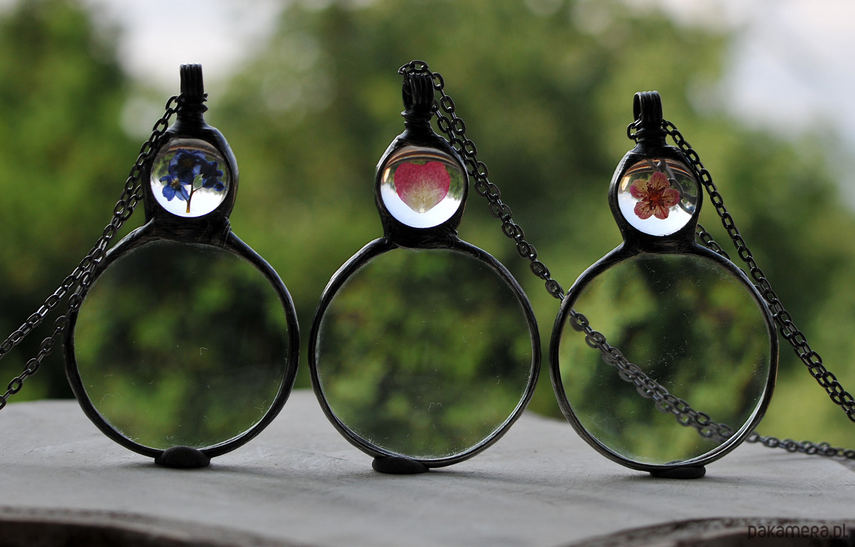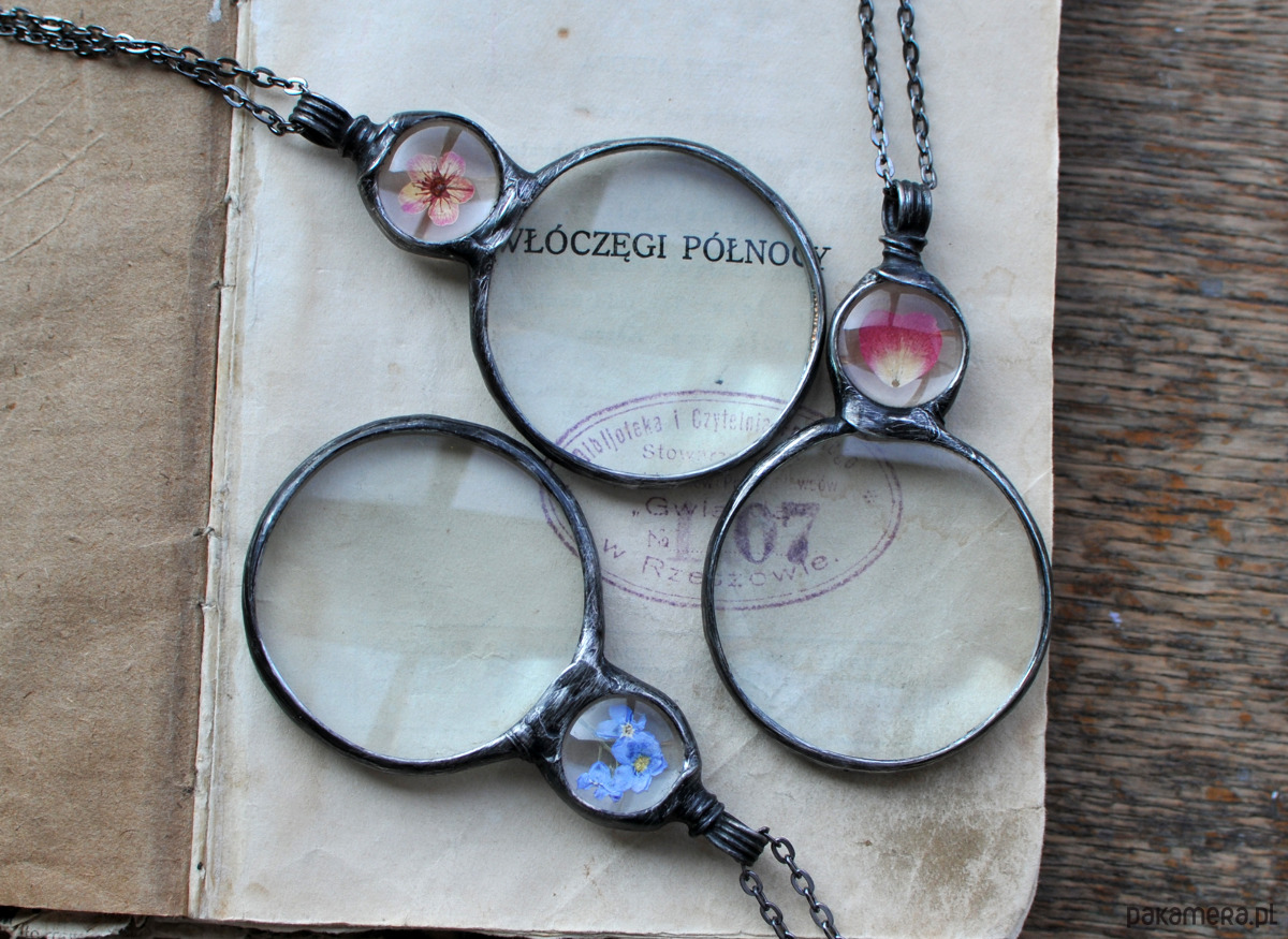 Uroczy naszyjnik z prawdziwym szkłem powiększającym, ozdobiony suszonymi kwiatami, zamkniętymi w szklanym oczku.