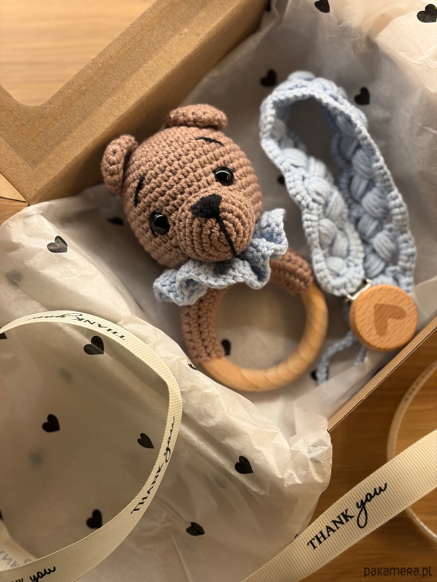 Śliczny gift box dla maluszka ✨mis grzechotka + praktyczna zawieszka do smoczka w odcieniach baby blue. Idealnie się sprawdzi jako prezent z okazji narodzin / przyjęcia babyshower / chrztu.