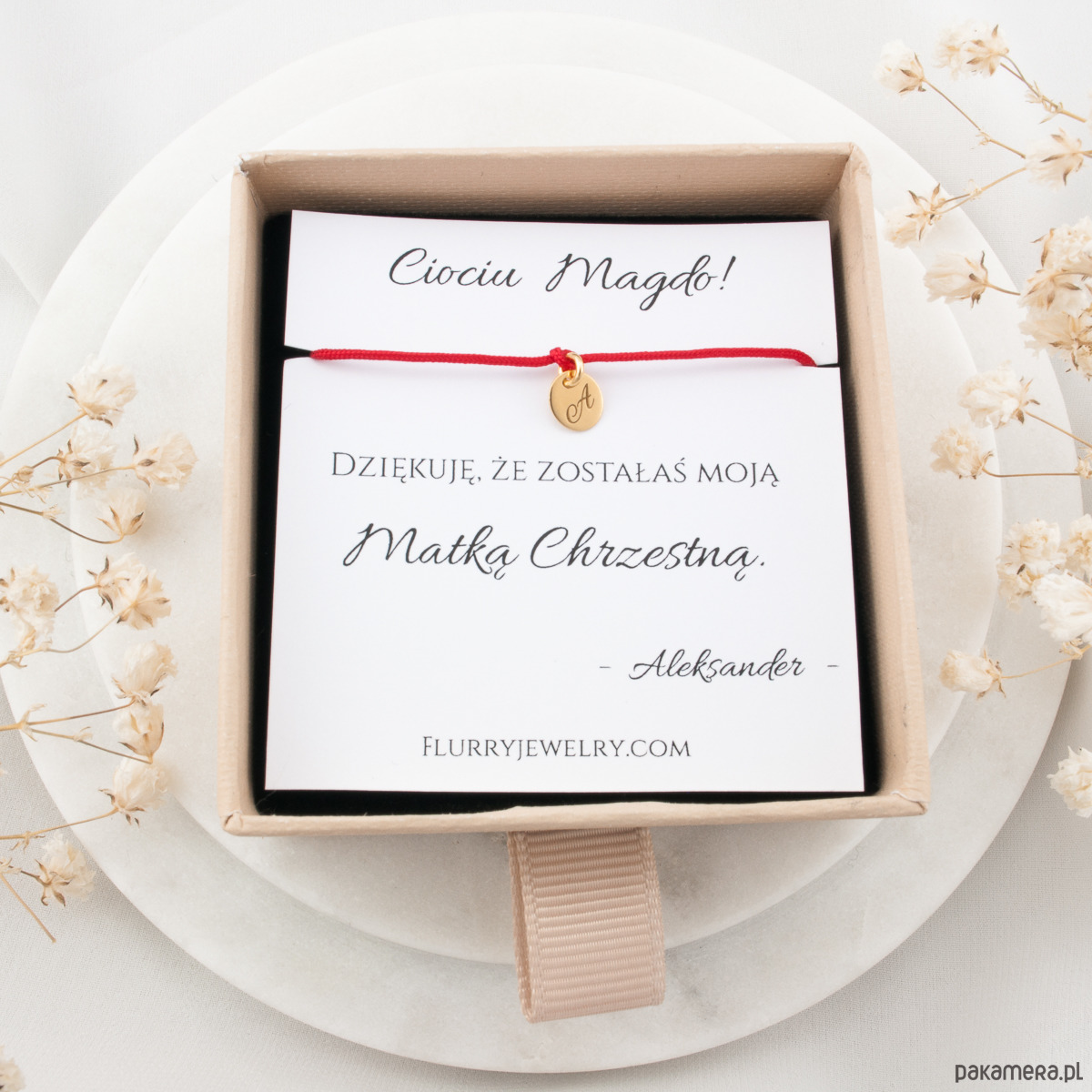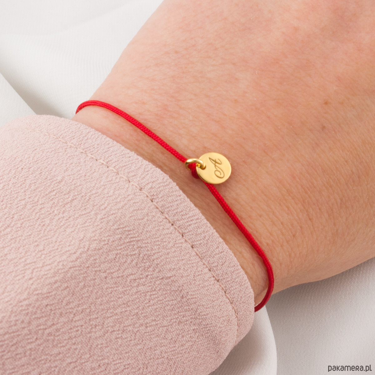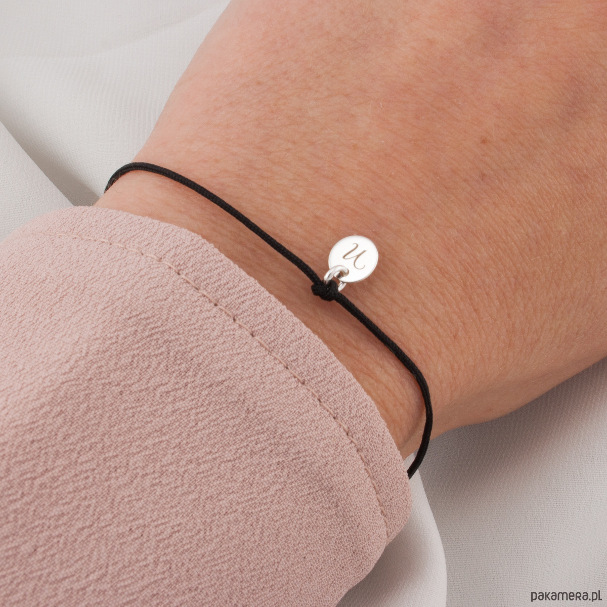 Bransoletka dla matki chrzestnej, prezent dla przyszłej matki chrzestnej. Połączenie delikatnego kolorowego sznureczka i srebrnej zawieszki z wygrawerowaną pierwszą literką imienia dziecka. Sznureczek można łatwo dopasować do nadgarstka i regulować za pomocą ściąganego zapięcia.