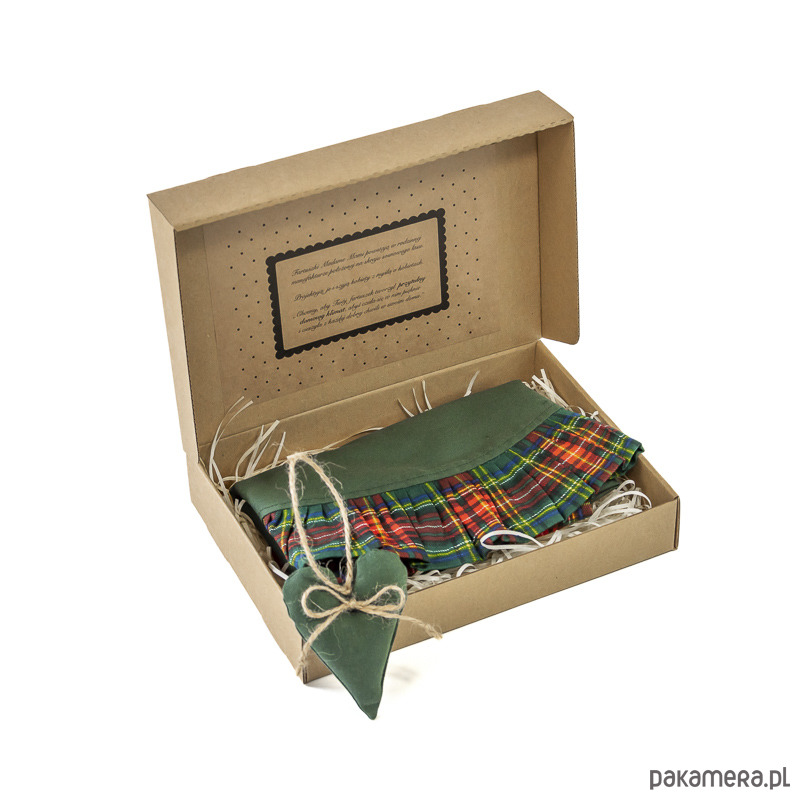 W pudełku prezentowym znajduje się również urocza zawieszka w kształcie serca i to ją w pierwszej kolejności zobaczy obdarowana kobieta! Serduszko jest wykonane z tej samej tkaniny, co fartuch, co przekłada się na spójny i elegancki wizerunek podarunku.