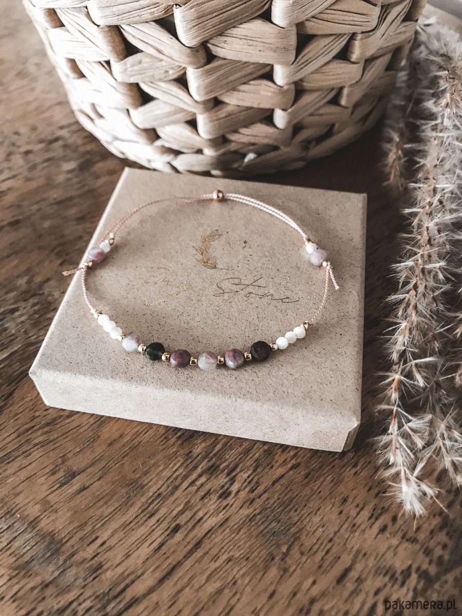 Bransoletka wykonana na jedwabnej nici z kamieni kolorowego turmalinu, masy perłowej oraz srebrnych koralików próby 925 pozłacanych 24K złotem. Piękne kolory turmalinu przekładane pozłacanymi koralikami tworzą razem biżuterię dodającą nieco koloru naszej stylizacji.