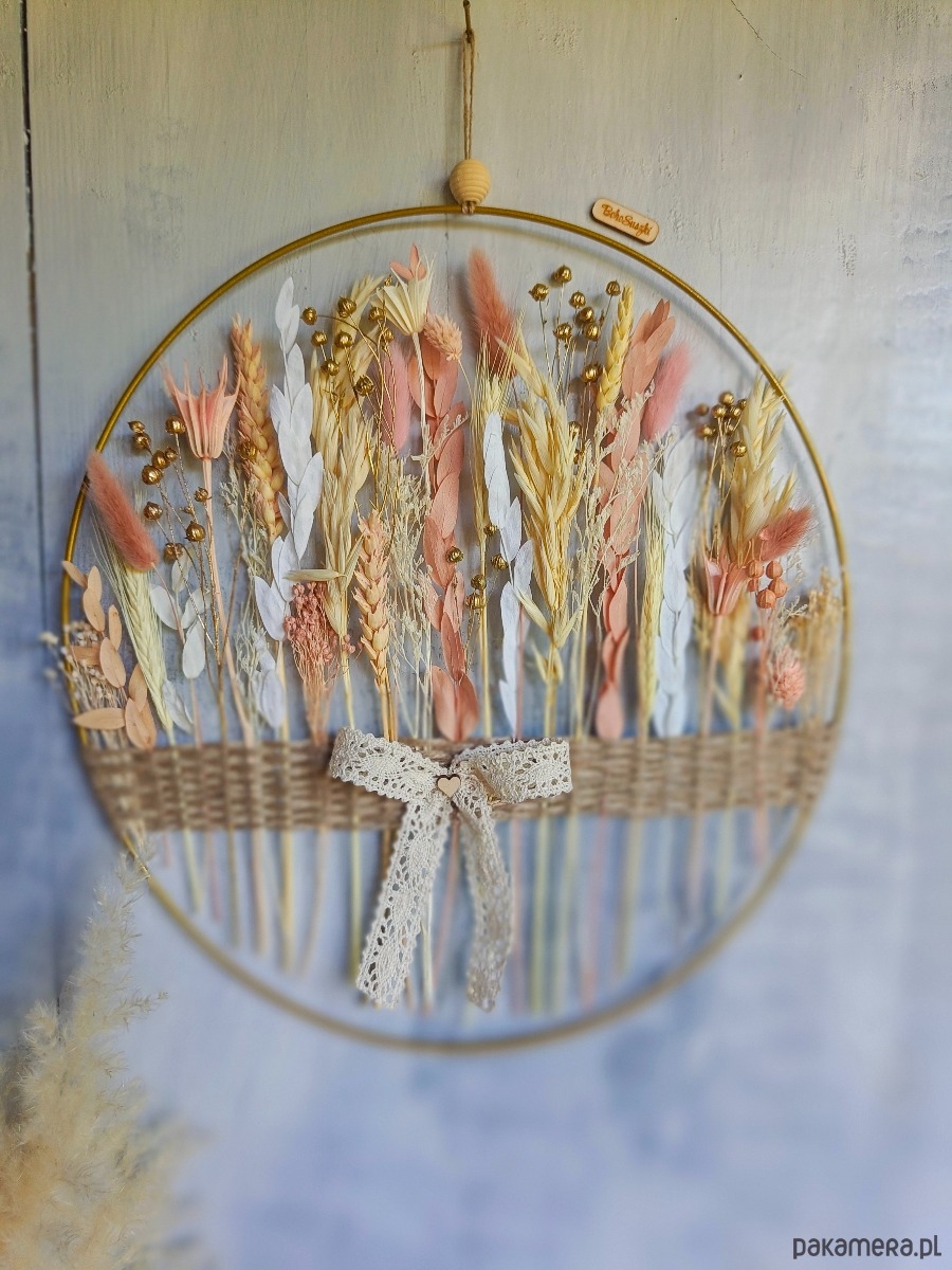🌿 Ta ręcznie wykonana dekoracja doskonale uzupełni wystrój domu Twoich Dziadków. Idealna do zawieszenia na ścianie, drzwiach, w oknie czy nad kominkiem. Subtelne kolory i naturalne materiały wprowadzą atmosferę spokoju i harmonii, dodając wnętrzu ciepła i przytulności.