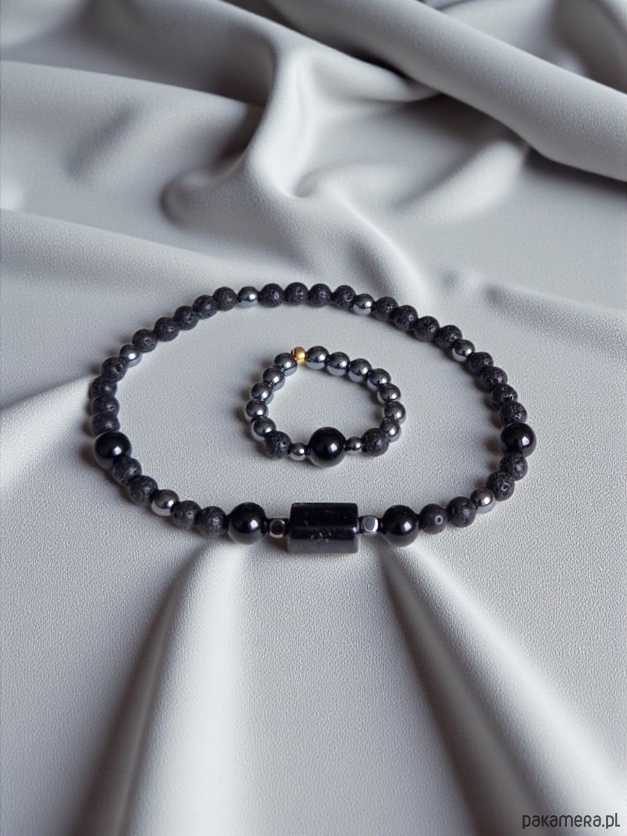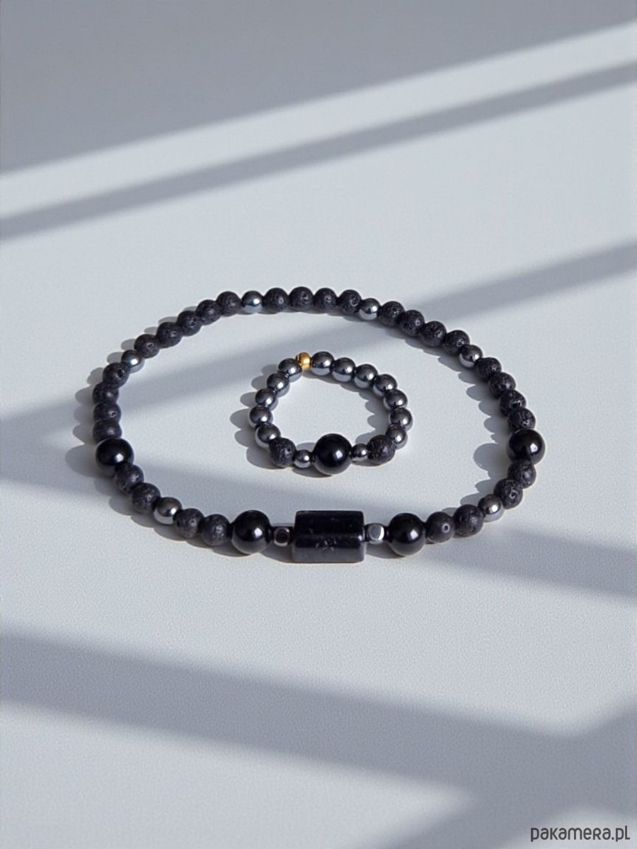 Bransoletka męska z kamieni naturalnych – turmalin, hematyt i lawa + pierścionek | Idealny prezent na Dzień Chłopaka