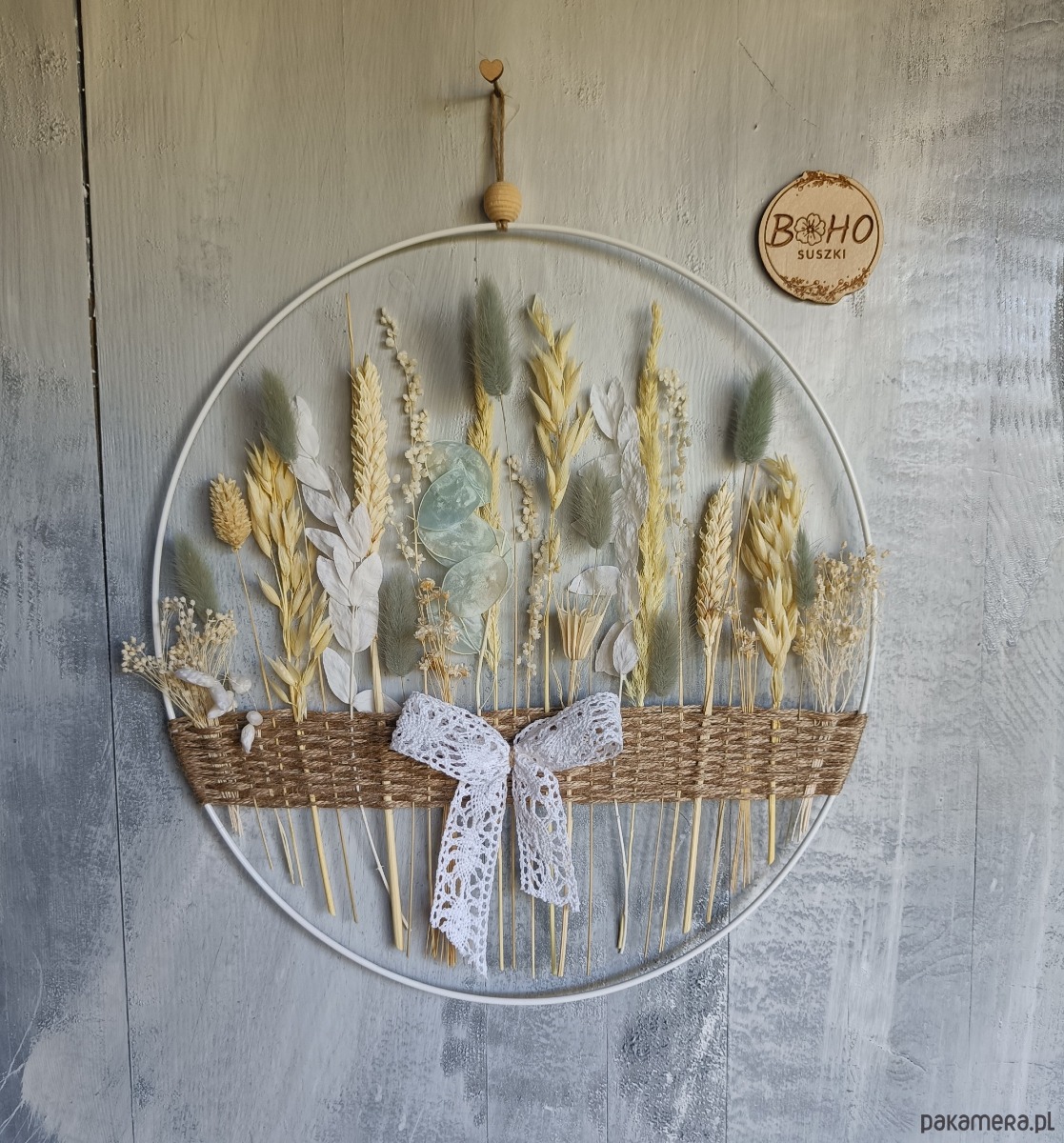 Kwiecista obręcz, wianek w stylu boho - biała obręcz ozdobiona sznurkiem jutowym, koronkową kokardką i suszonymi kwiatami w kolorach szarym i beżowym.