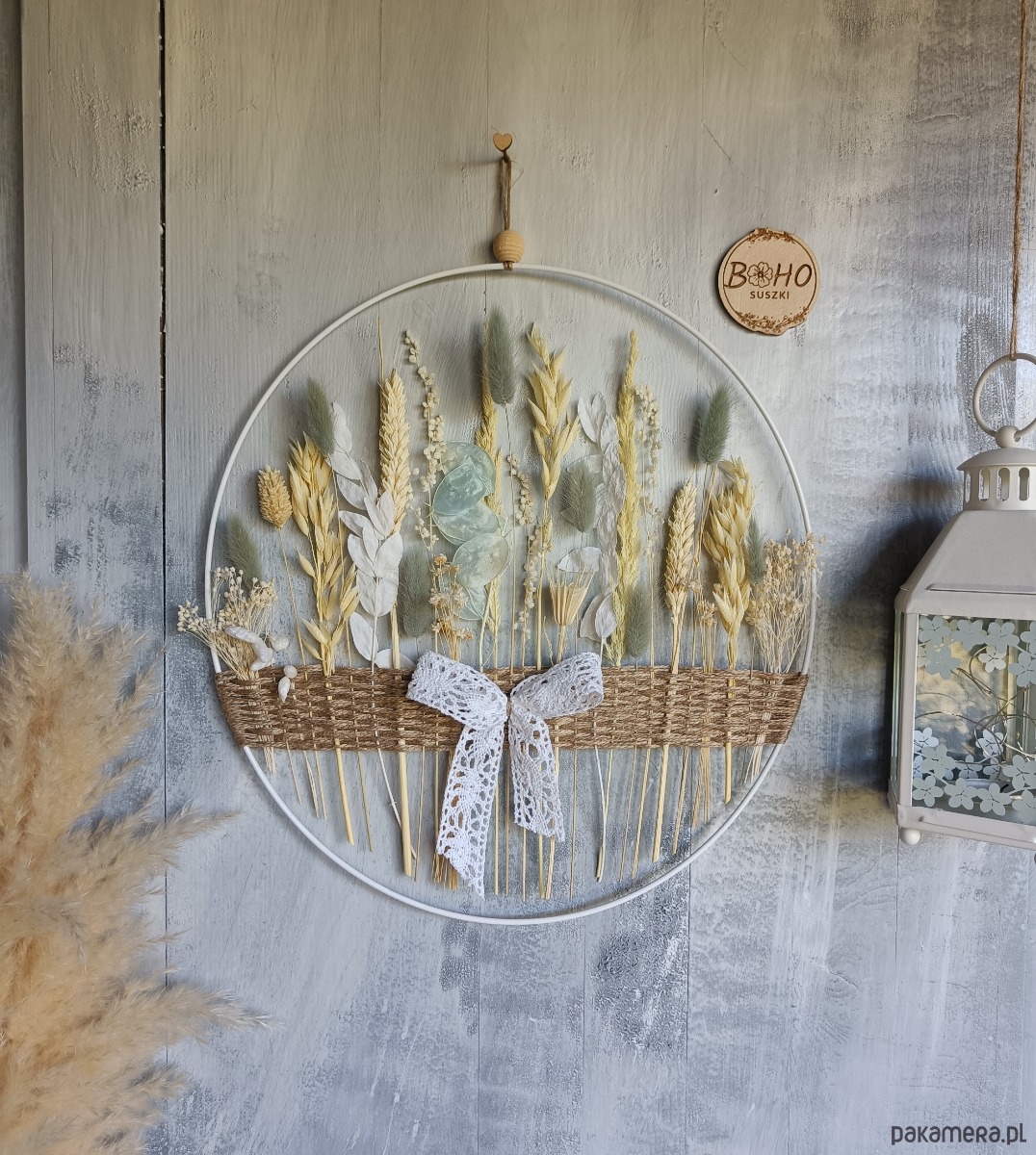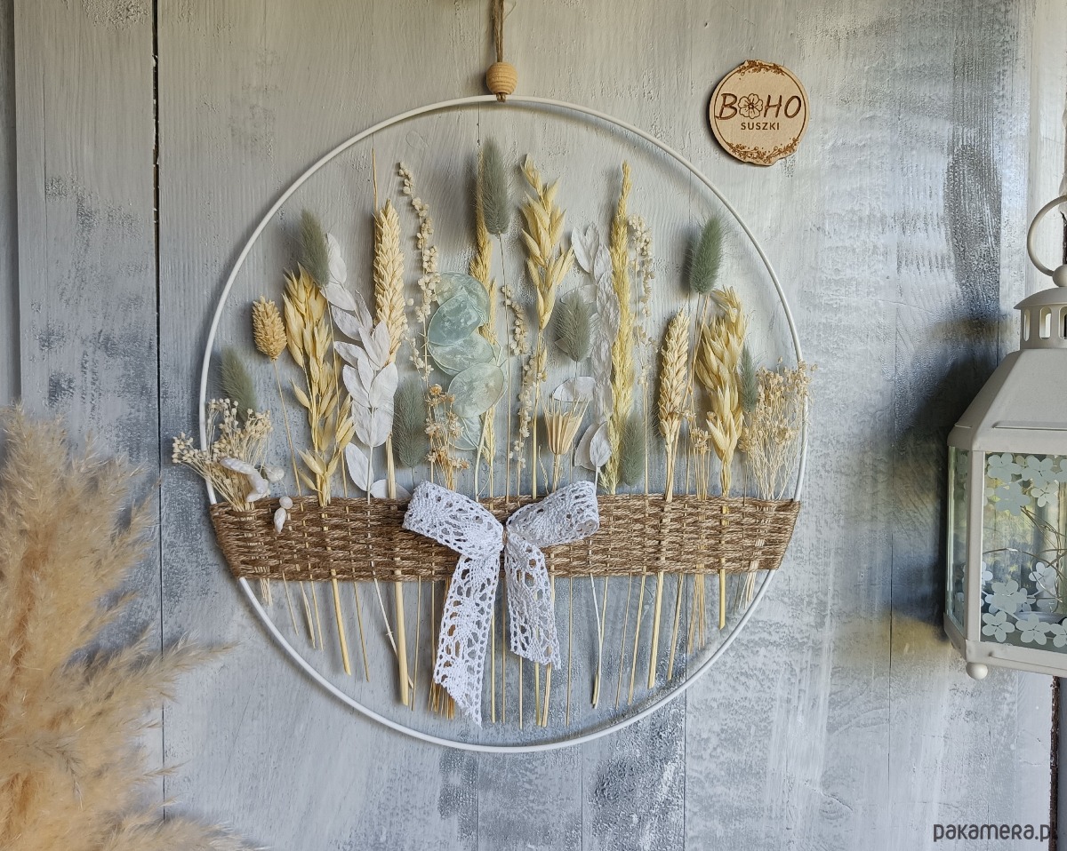 Obręcz z suszonymi kwiatami jest piękną dekoracją domu oraz idealnym pomysłem na prezent na parapetówkę, Dzień Mamy, na urodziny, dla przyjaciółki, na zakończenie roku szkolnego lub z innej okazji.