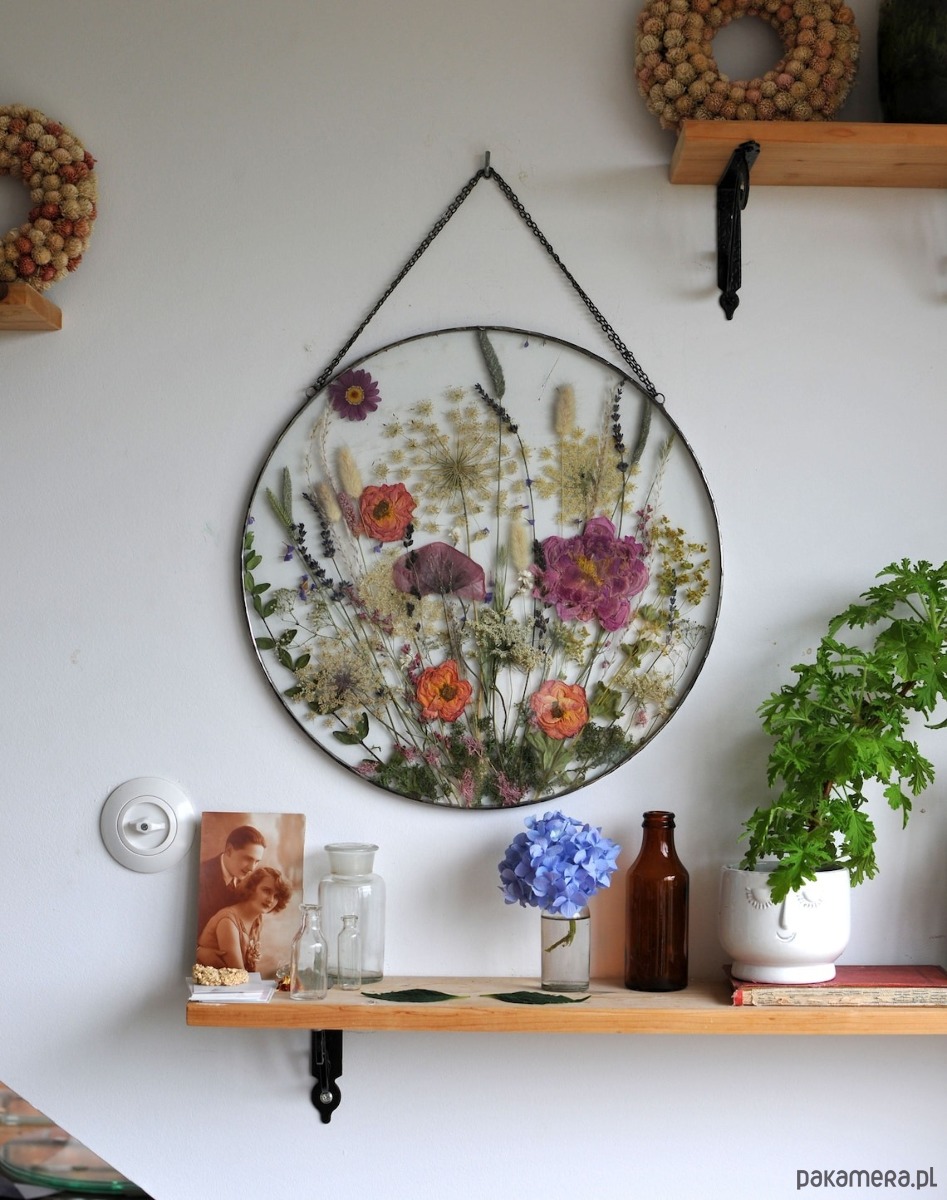 W szkle umieszczone są prawdziwe, ususzone rośliny. Piękny ogród za szkłem.