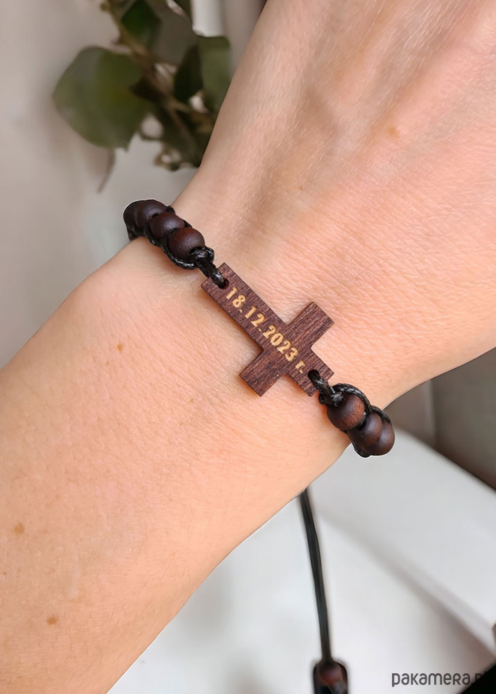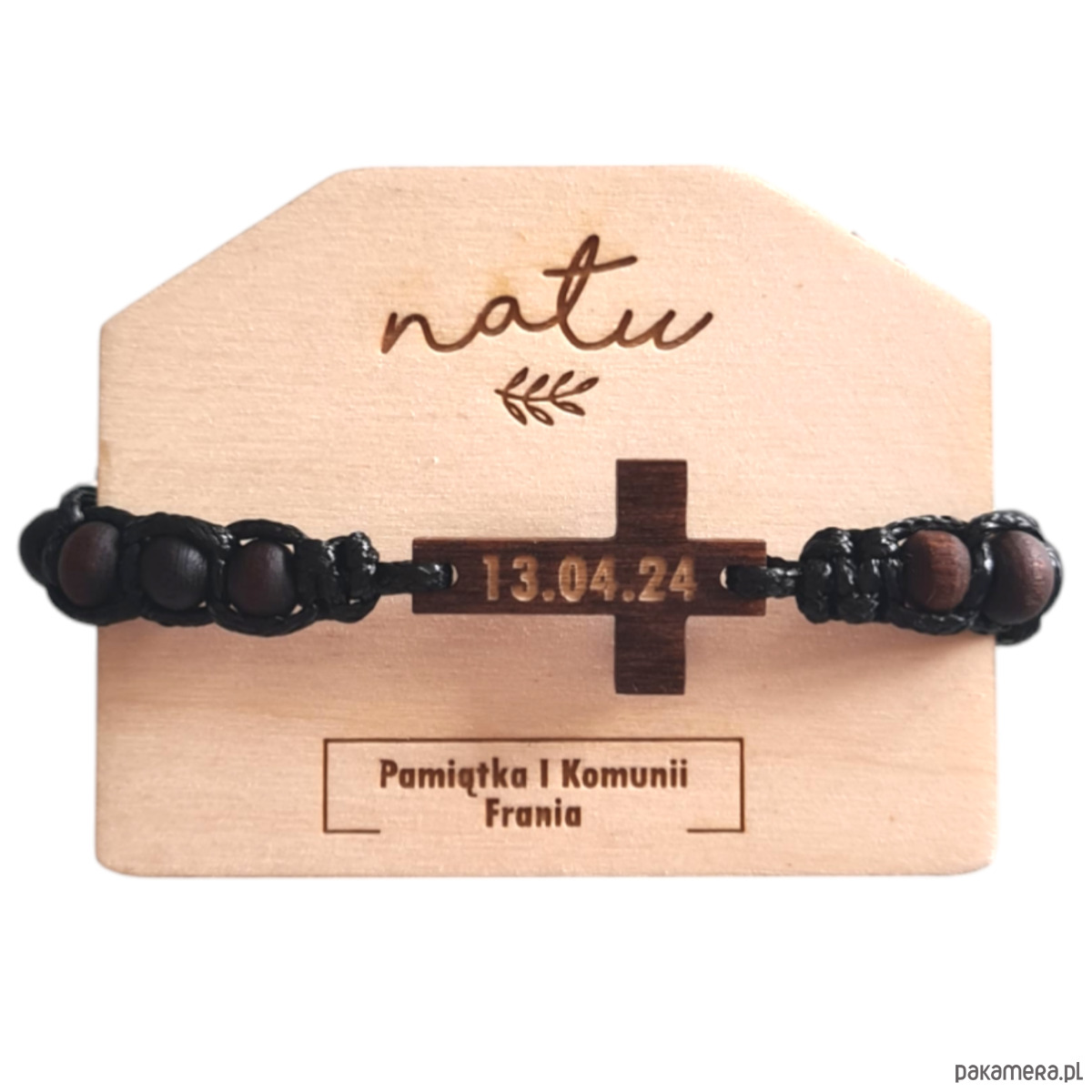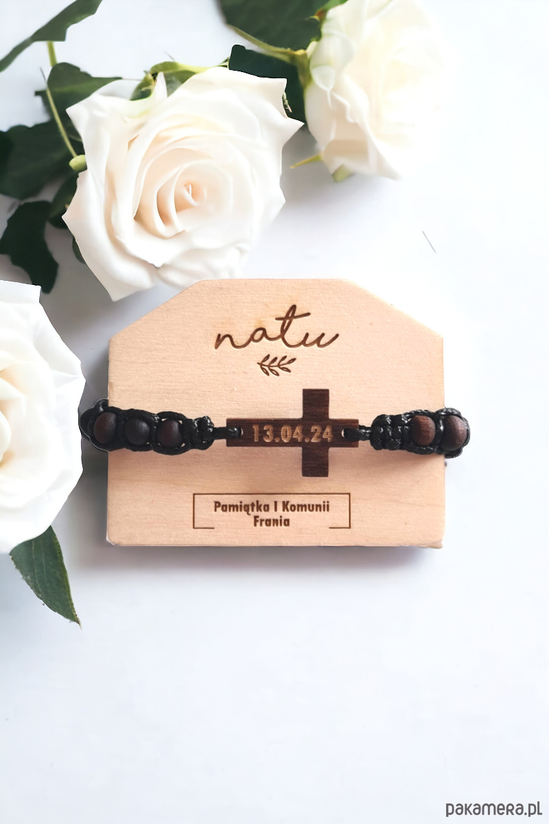 Ta wyjątkowa bransoletka łączy w sobie elegancki krzyżyk z personalizowanym grawerem oraz 10 drewnianymi koralikami, co nadaje jej charakterystyczny wygląd przypominający różaniec. To idealny sposób na wyrażenie swojej wiary lub podarowanie wyjątkowego prezentu bliskiej osobie, zwłaszcza z okazji Komunii lub Bierzmowania.