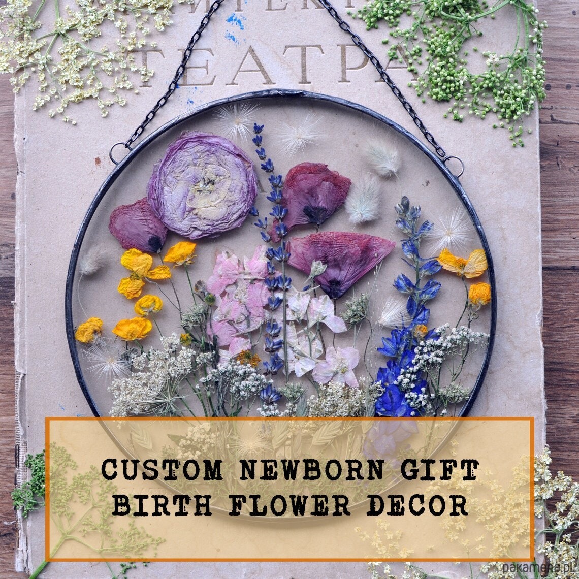 Personalizowany dekor z kompozycją z kwiatów urodzeniowych. Prezent na rocznicę.