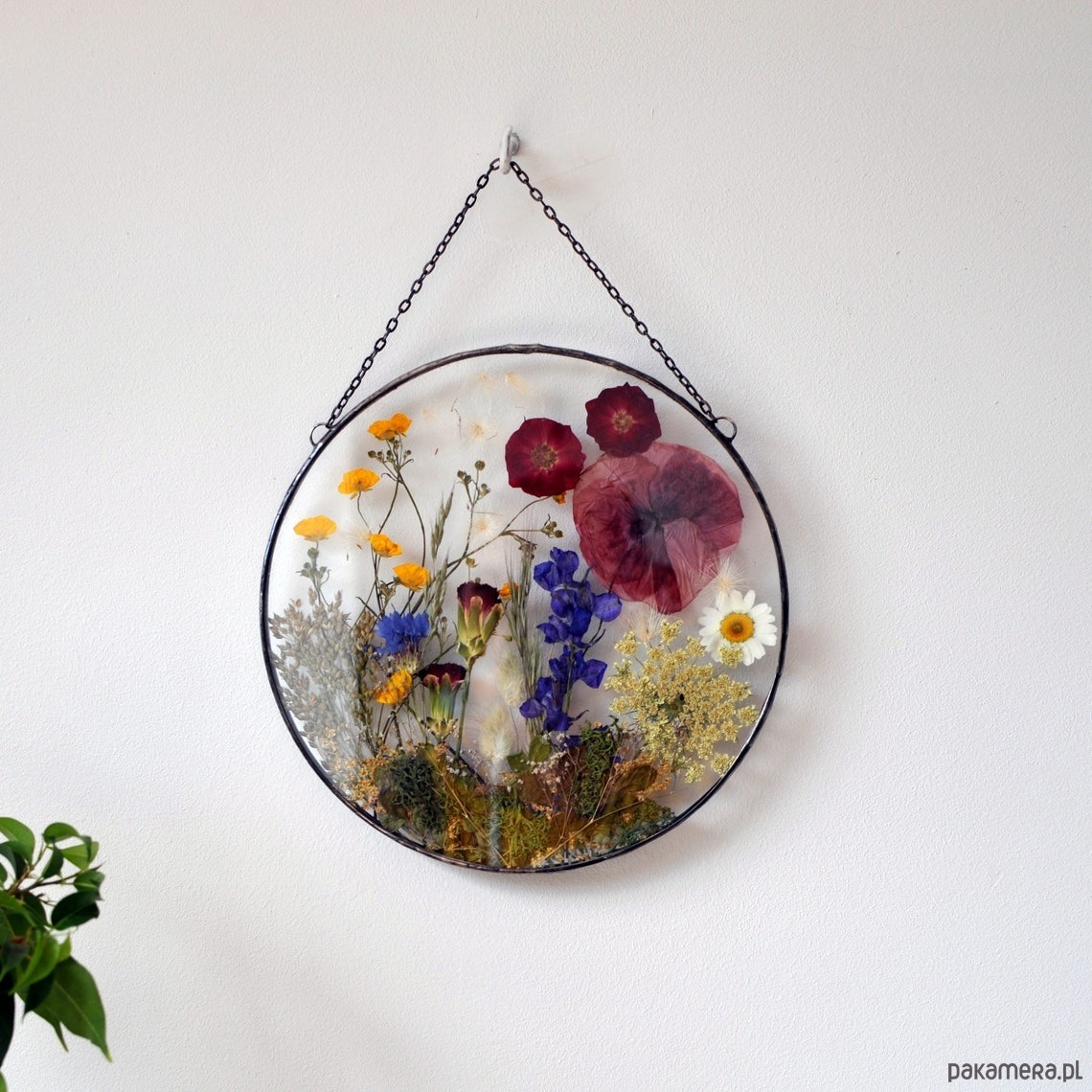 W szkle umieszczone są prawdziwe, ususzone rośliny. Piękny ogród za szkłem.