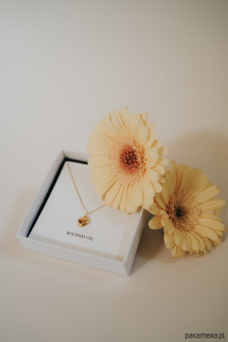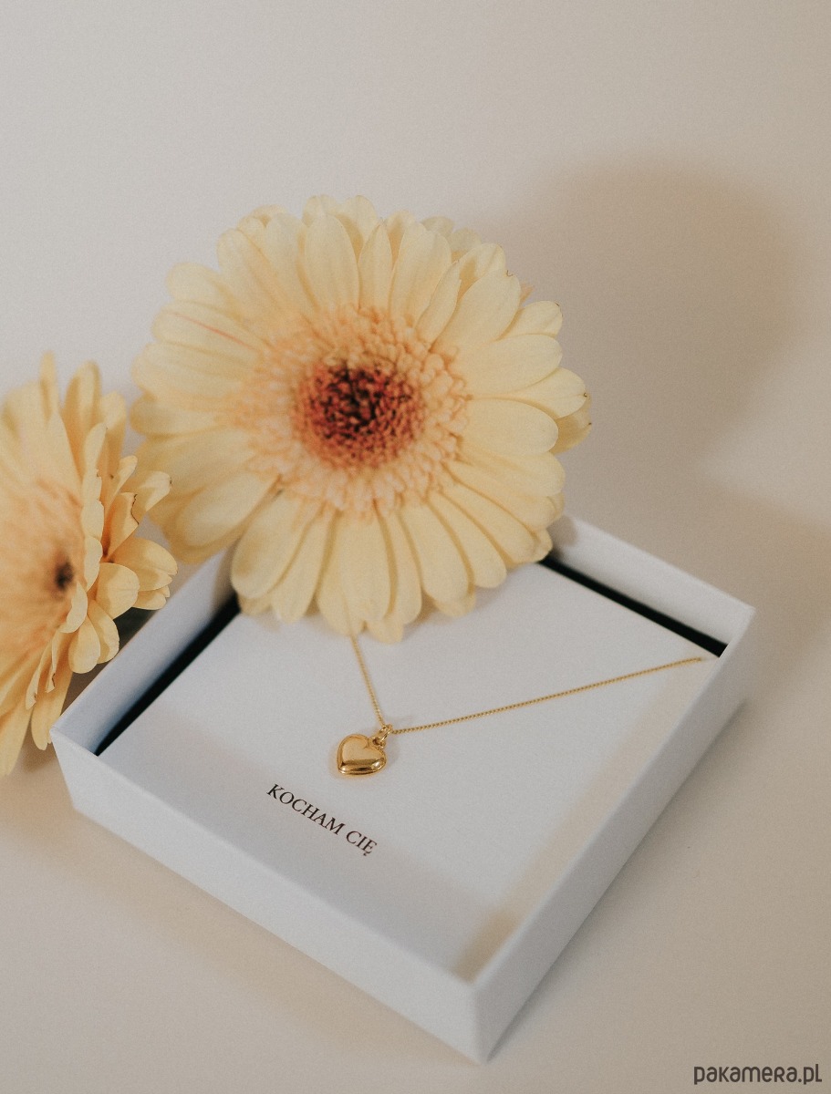 Delikatny naszyjnik z motywem serca, zapakowany w białe pudełeczko z karteczką „Kocham Cię”. Gotowy do wręczenia - bez dodatkowych przygotowań.