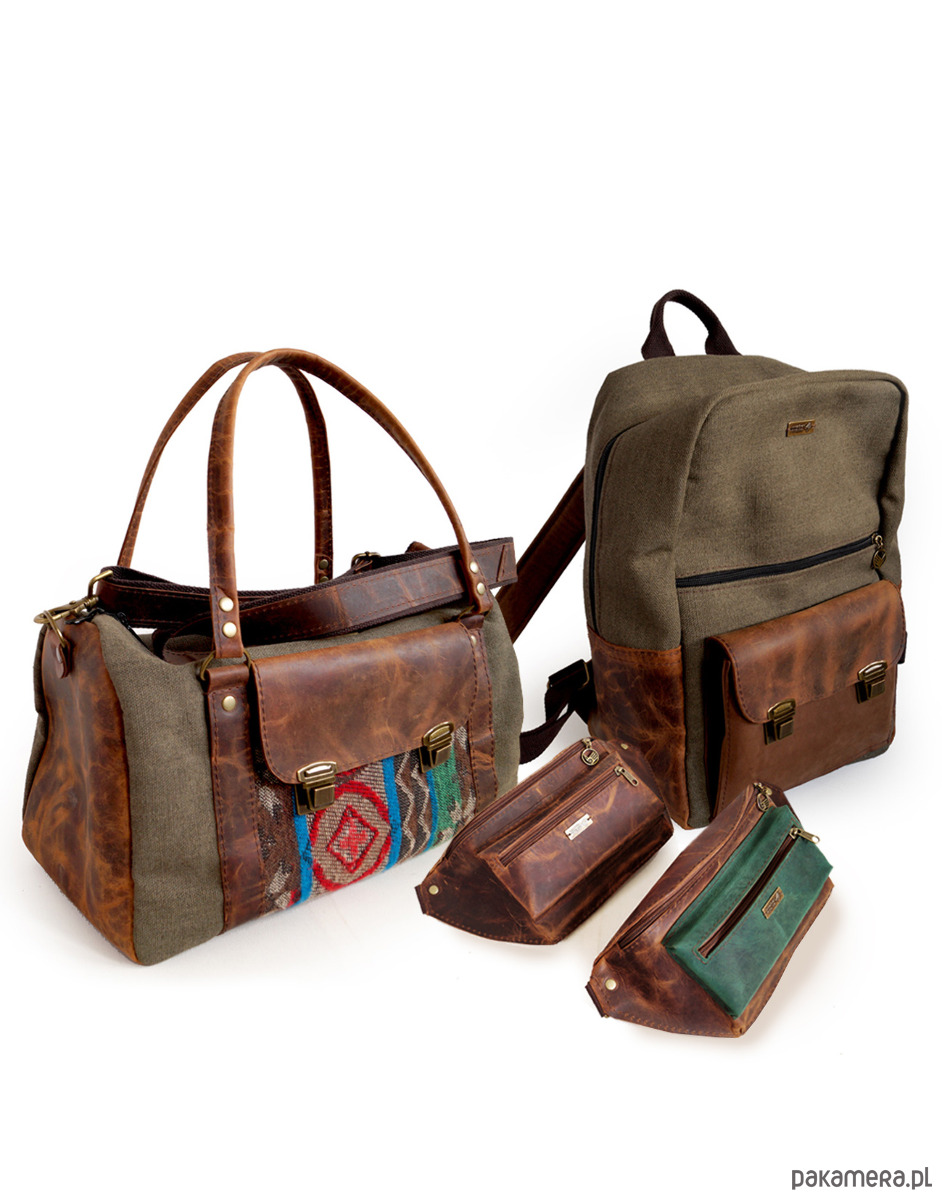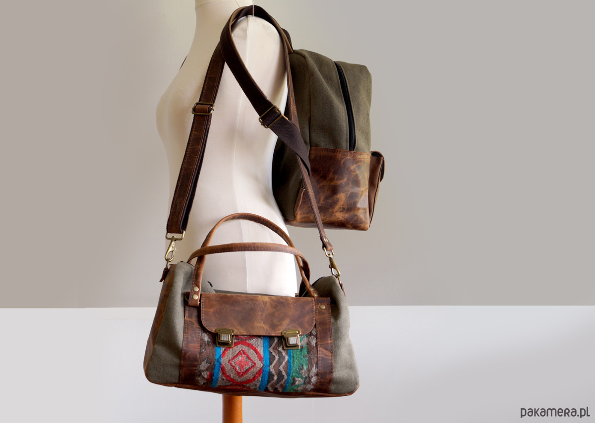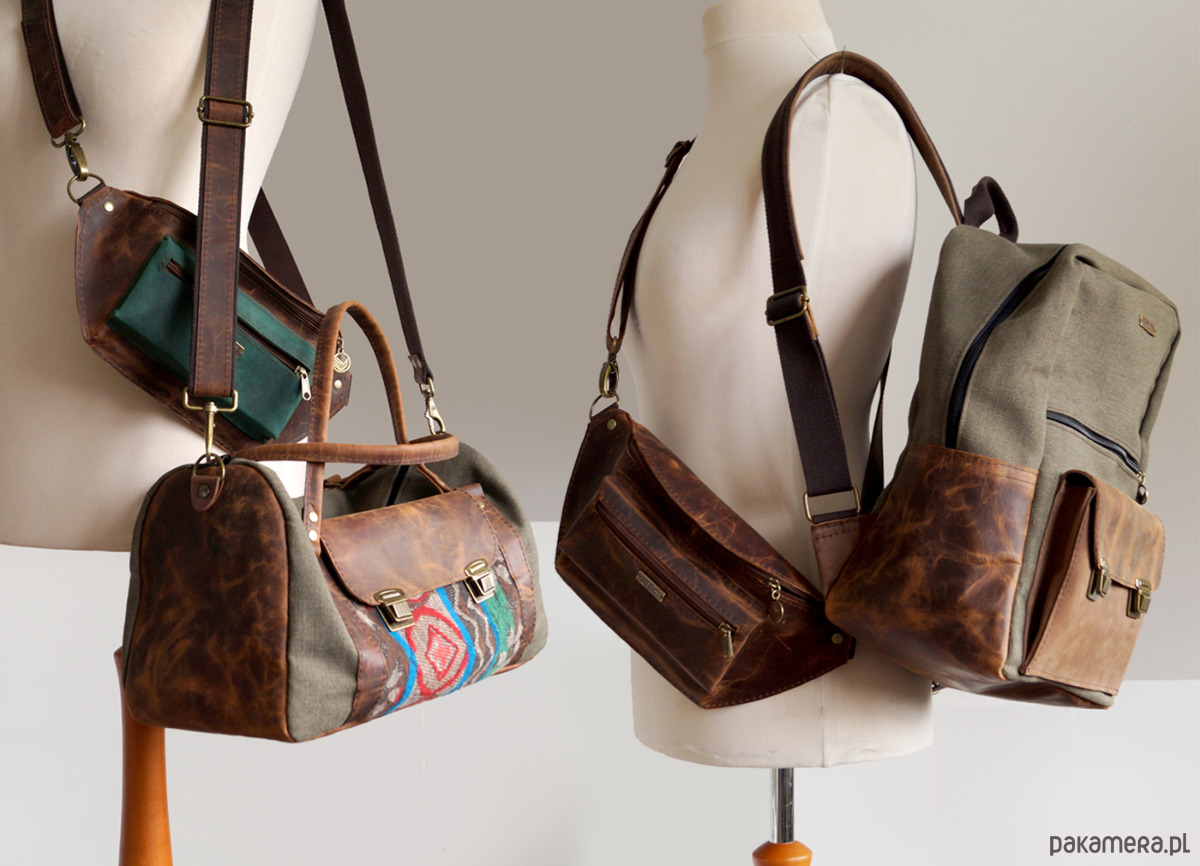 - Materiał: canvas, tkanina, skóra naturalna