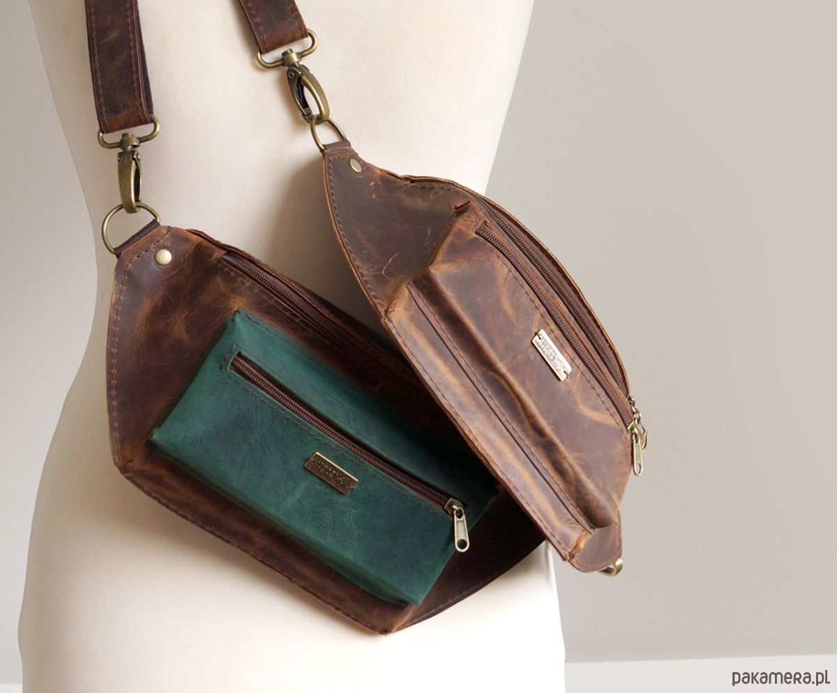 Dwie nerki o klasycznym, podłużnym kroju, uszyte ze świetnej jakości skór naturalnych, bydlęcych, typu crazy w odcieniach brązu i zieleni. Składają się z dużej, głównej komory, zamykanej zamkiem błyskawicznym, pojemnej kieszeni przedniej oraz kieszeni tylnej. Uszyte z dużą dbałością o każdy szczegół. Wymiary: wysokość – 15, szerokość – 30, głębokość – 7, dł. regulowanego paska – 66-115cm.