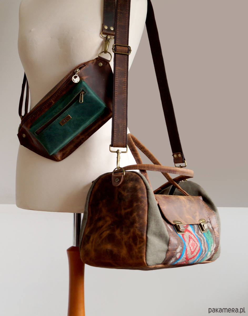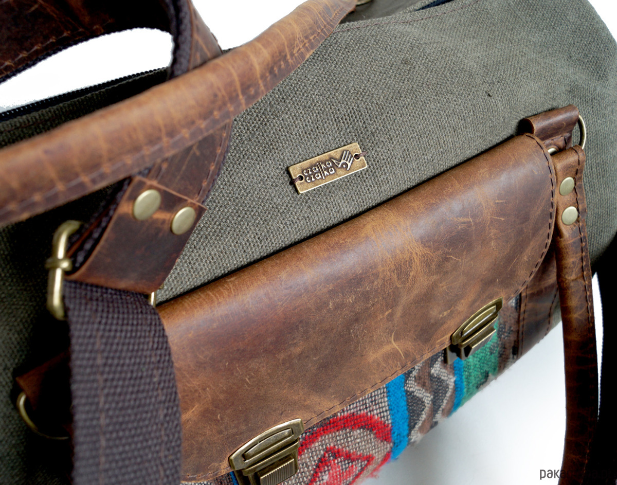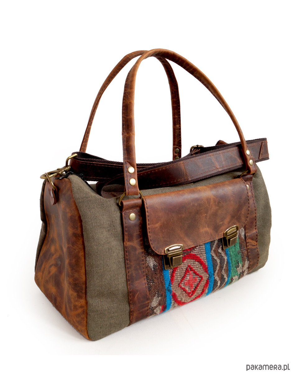 Torba podróżna zaprojektowana z myślą o podróży samolotem. Lekka i bardzo pojemna. Wymiary optymalne dla większości przewoźników. Uszyta z brezentu - bardzo mocnej i wytrzymałej tkaniny, impregnowanej wodo- i ognioodpornie, skóry naturalnej, woskowanej crazy horse, oraz z grubo tkanego płótna, o etnicznym wzorze (również zaimpregnowanego). Wymiary 40/25/20cm. Wewnątrz brązowa podszewka, spora kieszeń na zamek i dwie kieszenie otwarte.