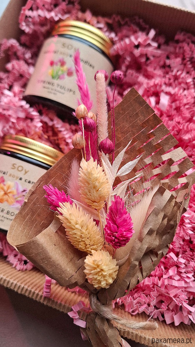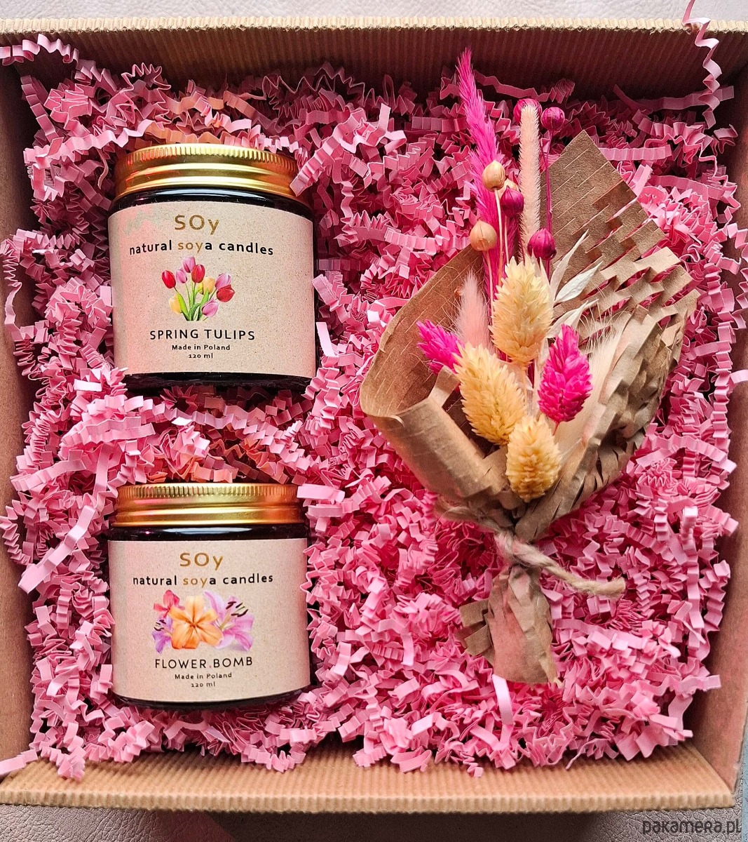 Zestaw prezentowy ze świecami sojowymi i suszonym bukietem kwiatów zapakowany jest w karbowane pudełko z różowym wypełnieniem. Prezent przewiązany brzoskwiniową kokardą.