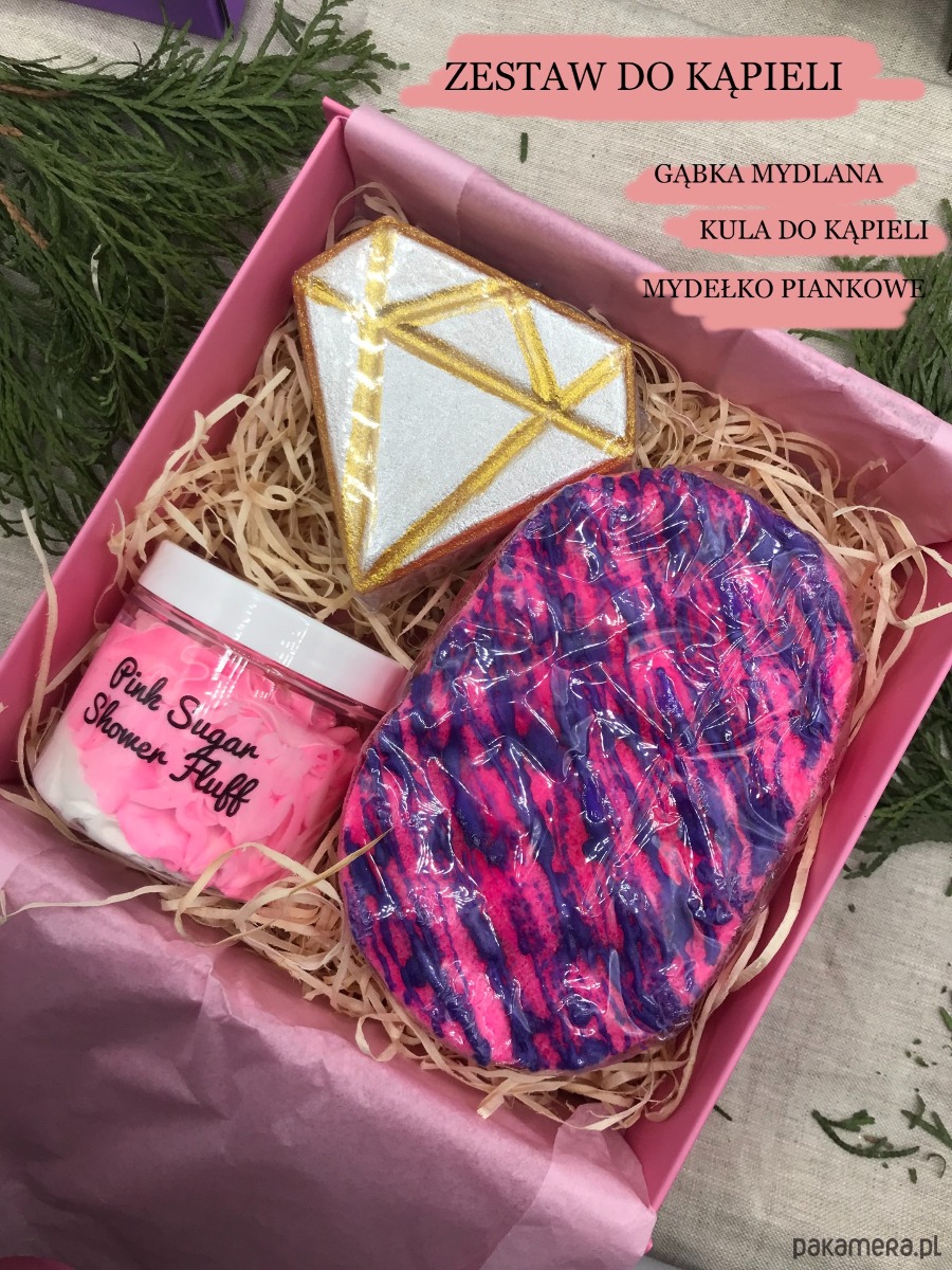 Różowe pudełko kryjące 3 unikatowe produkty do kąpieli: