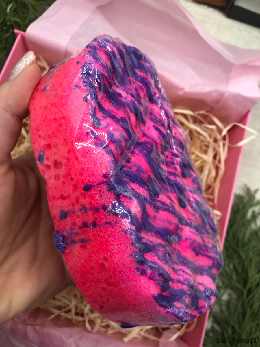 GĄBKA MYDLANA- Gąbka nasączona mydłem o słodkim, kwiatowym zapachu (Love Spell). Gąbkę należy namoczyć i używać jak tradycyjną gąbkę. Po zakończeniu używania odłożyć w suche miejsce aby mydło w niej zawarte nie "zużywało się". Gąbka posłuży na około 30 kąpieli jeśli będzie używana w ten sposób.