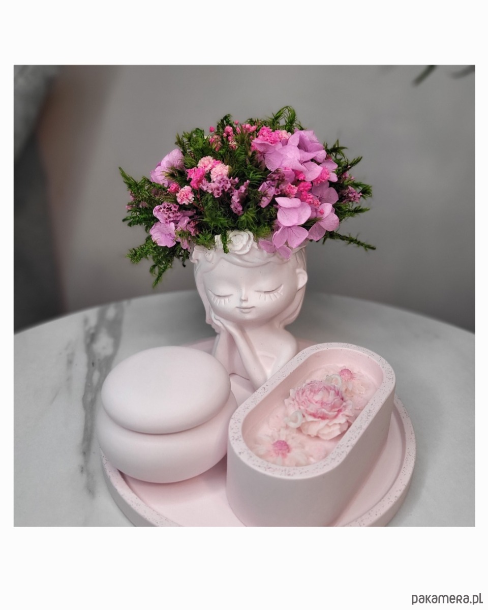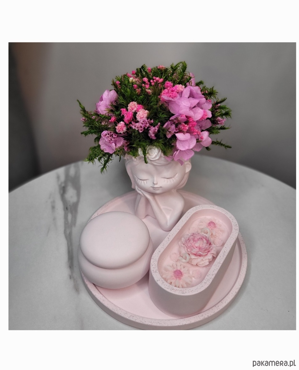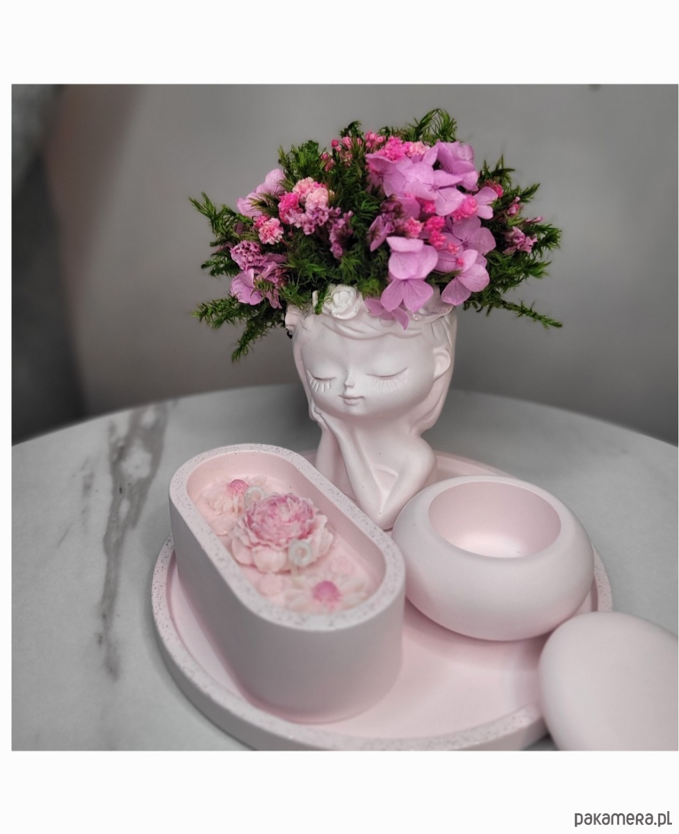 Odkryj unikalny zestaw dekoracyjny stworzony z miłością i dbałością o każdej detale. Zestaw wykonany z gipsu, składa się z delikatnej, ręcznie ozdobionej świecy oraz uroczej doniczki w kształcie dziewczynki. Jej "włosy" tworzy stabilizowany mech, ozdobiony subtelnymi kwiatami w pastelowych kolorach, co dodaje całości wyjątkowego uroku.
