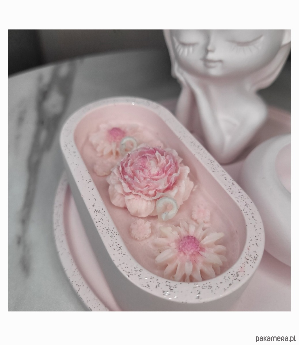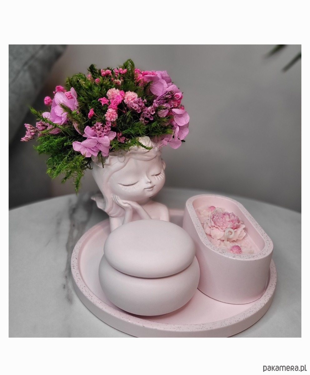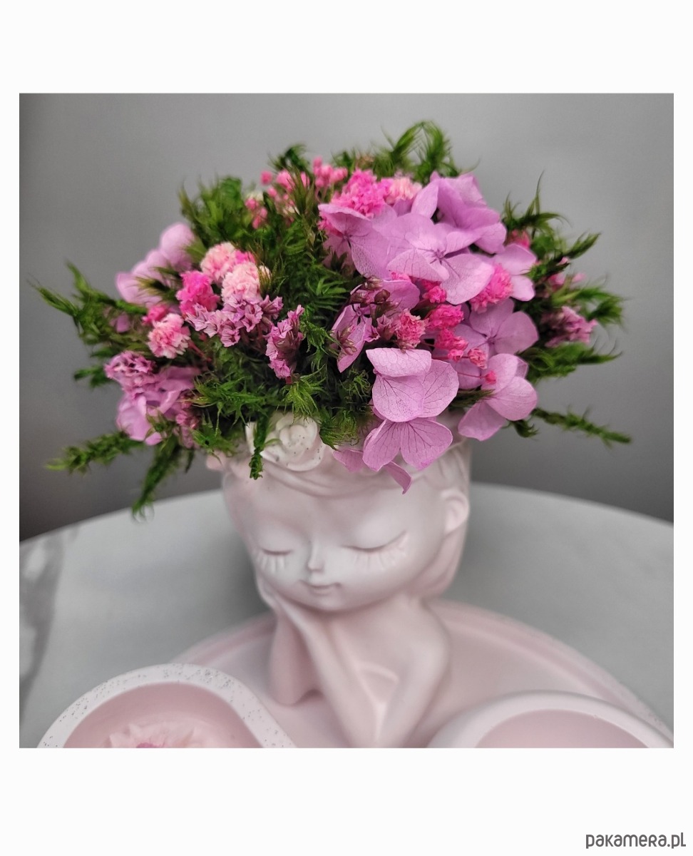 Odkryj unikalny zestaw dekoracyjny stworzony z miłością i dbałością o każdej detale. Zestaw wykonany z gipsu, składa się z delikatnej, ręcznie ozdobionej świecy oraz uroczej doniczki w kształcie dziewczynki. Jej "włosy" tworzy stabilizowany mech, ozdobiony subtelnymi kwiatami w pastelowych kolorach, co dodaje całości wyjątkowego uroku.