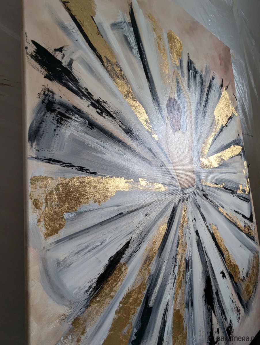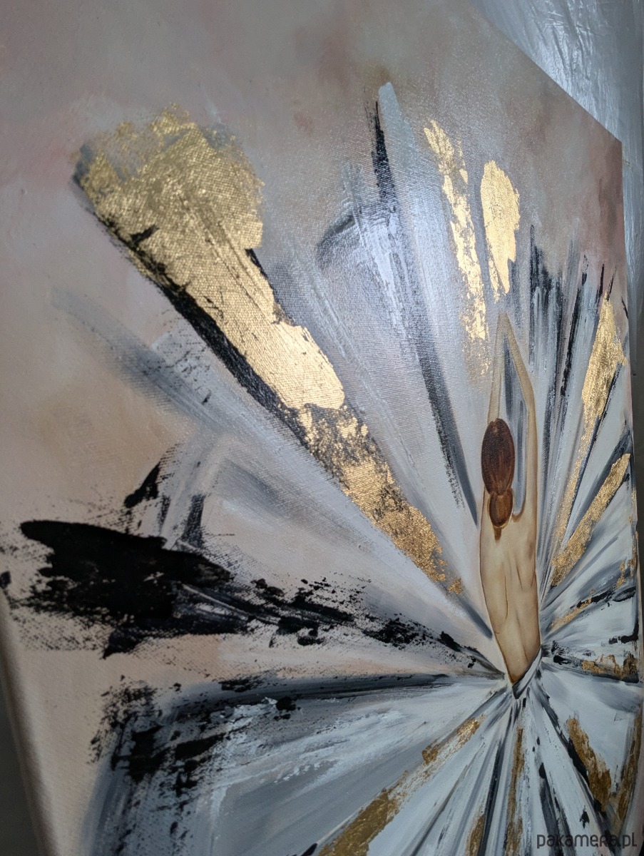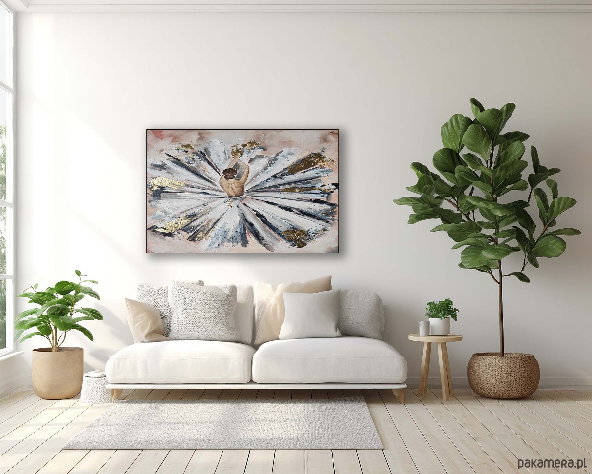 Delikatna tancerka w wirze ruchu, z rozpostartą tutu w odcieniach bieli i złota, unosi się na tle subtelnego różu i szarości. Złote akcenty mieniące się na spódnicy i ramionach dodają elegancji i blasku, tworząc iluzję lekkości i gracji. Ten obraz toIdealny punkt centralny w salonie, sypialni czy przestronnym lofcie, gdzie subtelne kolory współgrają z nowoczesnymi i klasycznymi aranżacjami.