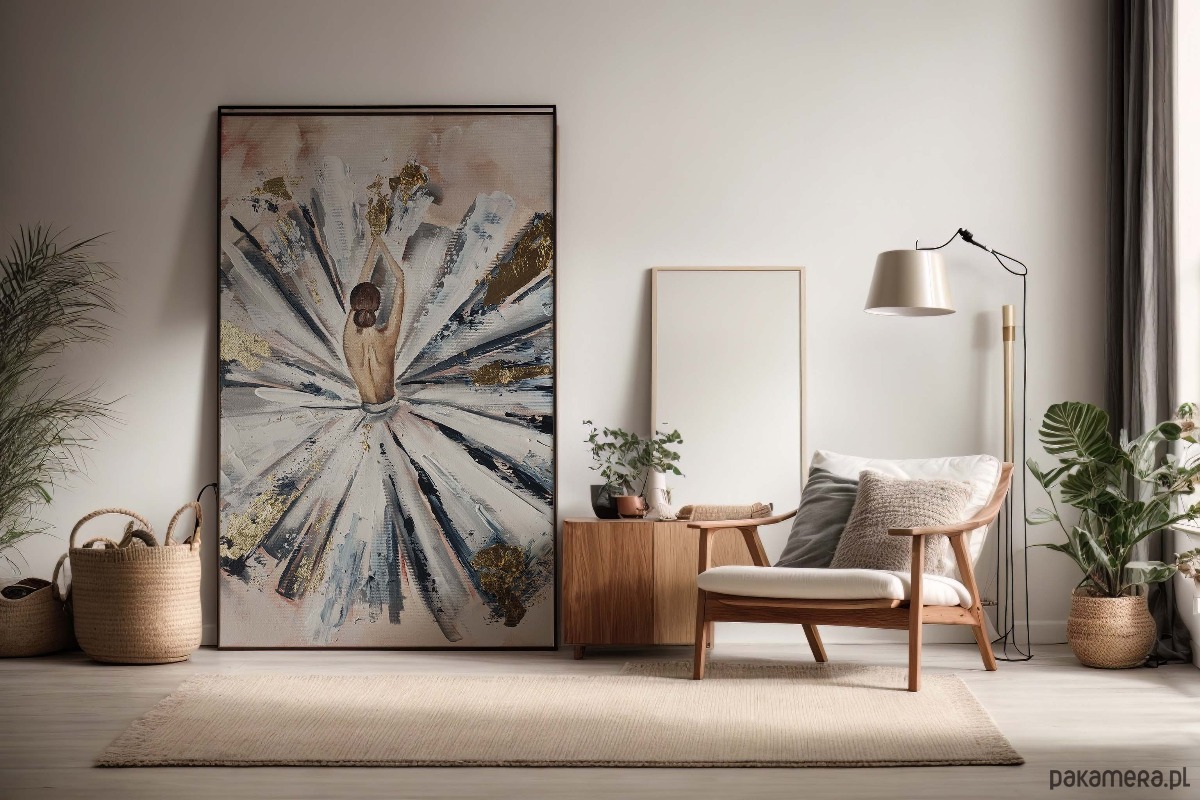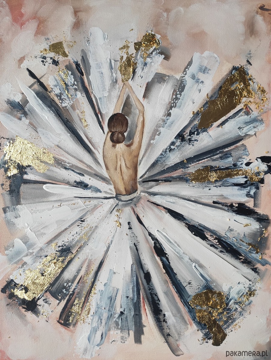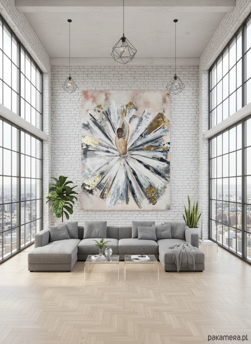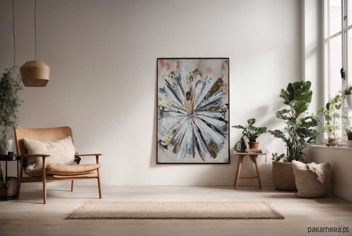 Delikatna tancerka w wirze ruchu, z rozpostartą tutu w odcieniach bieli i złota, unosi się na tle subtelnego różu i szarości. Złote akcenty mieniące się na spódnicy i ramionach dodają elegancji i blasku, tworząc iluzję lekkości i gracji. Ten obraz toIdealny punkt centralny w salonie, sypialni czy przestronnym lofcie, gdzie subtelne kolory współgrają z nowoczesnymi i klasycznymi aranżacjami.