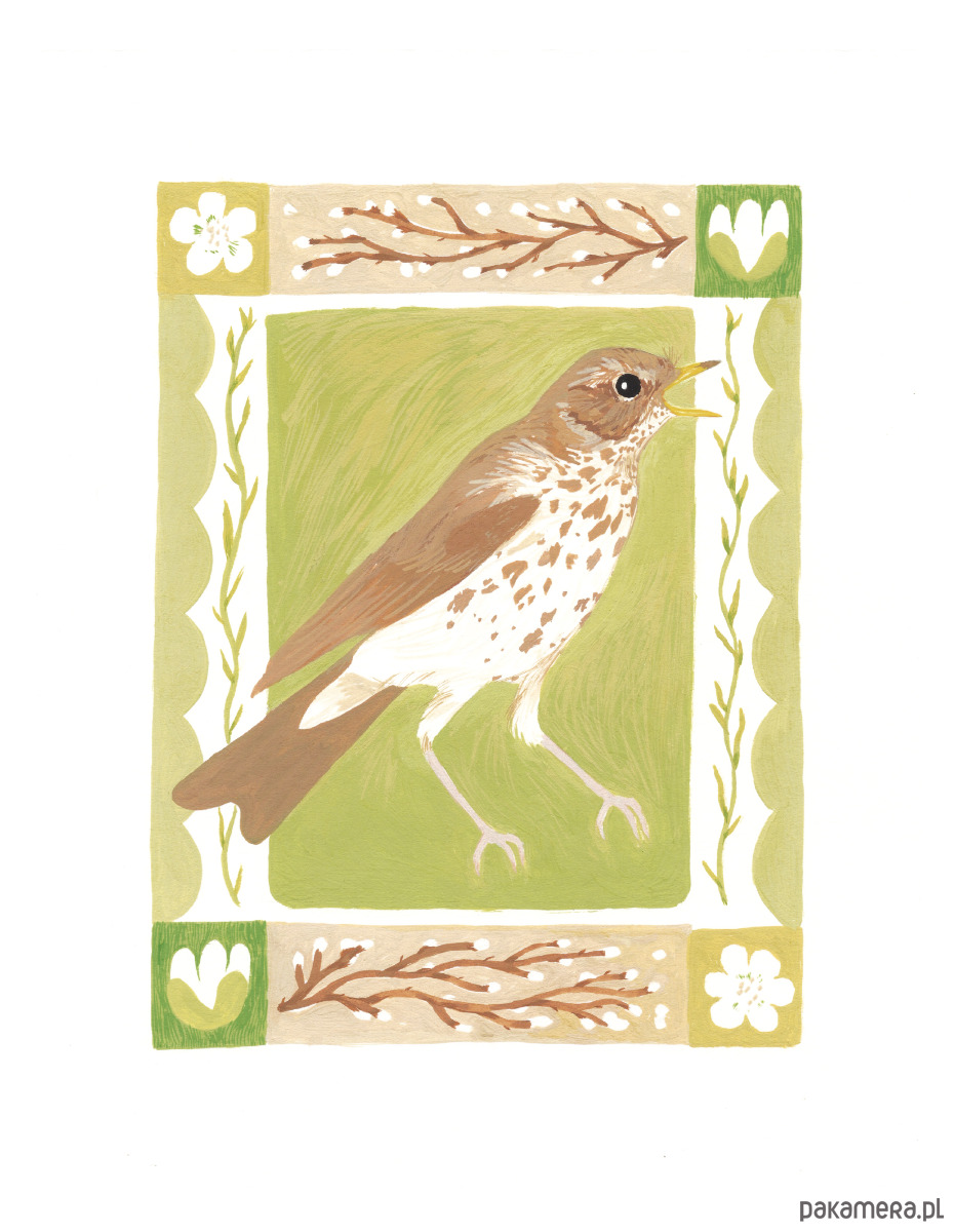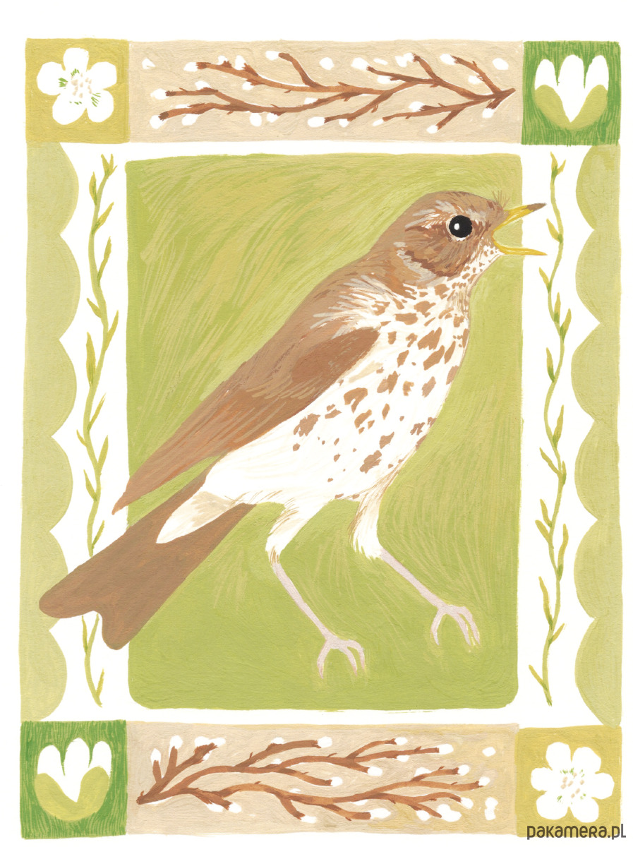 Rozśpiewany drozd śpiewak w klimacie wczesno wiosennym. Delikatna, szczegółowa ilustracja malowana gwaszem.
