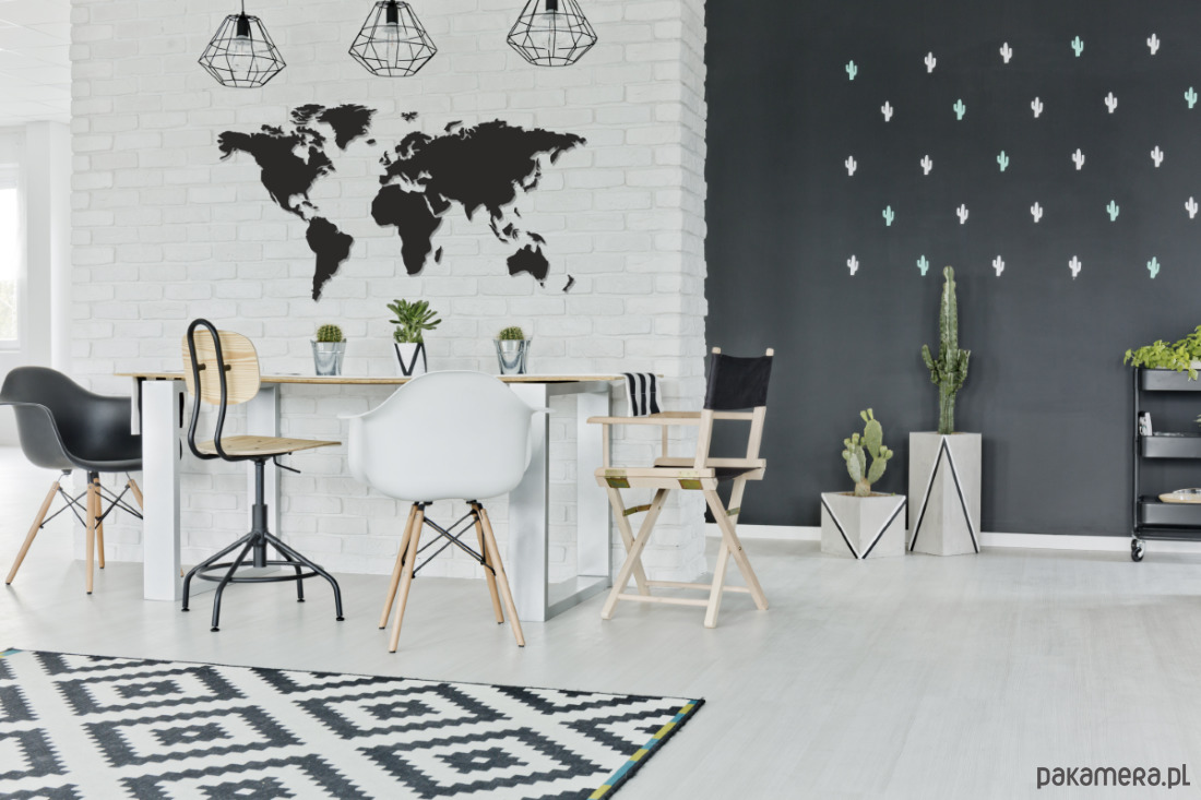 Cały glob w zasięgu...ściany. Ozdoba ścienna, przedstawiająca mapę świata pokryta jest farbą tablicową dzięki czemu swobodnie można pisać po niej kredą lub przyklejać magnesy. W skład zestawu (dostępnego w innych ofertach) wchodzi 30 elementów tworzących mapę świata o różnych szerokościach (120 cm, 160cm lub 200cm).