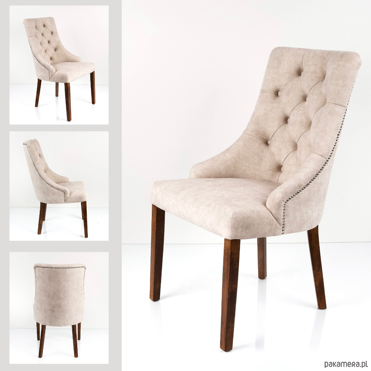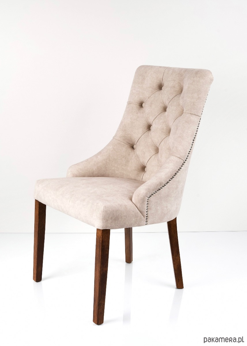 Krzesło Premium KR-21 Tkanina ZOYA 02 synonim elegancji dzięki ozdobnym pikowaniu typu Chesterfield na oparciu. Pinezka i gięte nogi w stylu ludwikowskim to ponadczasowy mebel do jadalni - piękny i funkcjonalny.