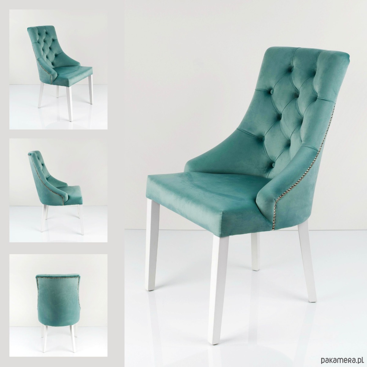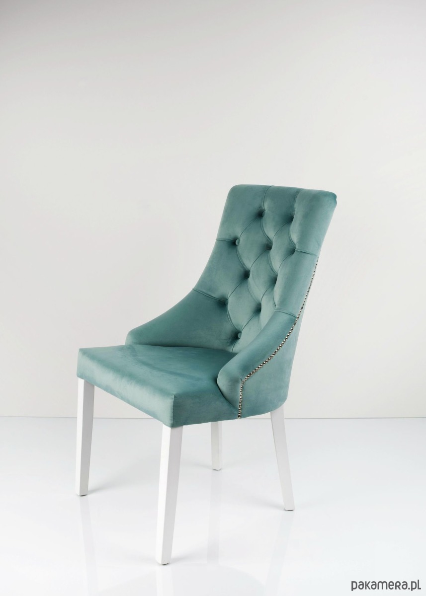 Krzesło Premium KR-21 Tkanina Piano 09 synonim elegancji dzięki ozdobnym pikowaniu typu Chesterfield na oparciu. Pinezka i gięte nogi w stylu ludwikowskim to ponadczasowy mebel do jadalni - piękny i funkcjonalny.