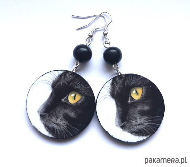 kolczyki drewniane, ozdobione metodą decoupage, dwustronne, starannie wykończone farbami akrylowymi i zabezpieczone wielokrotnie lakierem, koraliki drewniane, bigle posrebrzane, długość kolczyków bez bigli: 5,5 cm, średnica: 3,5 cm, bardzo lekkie