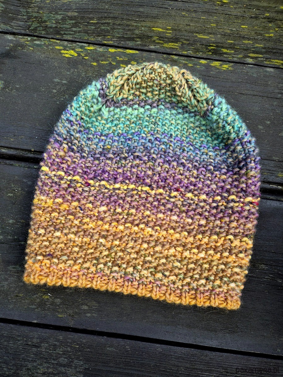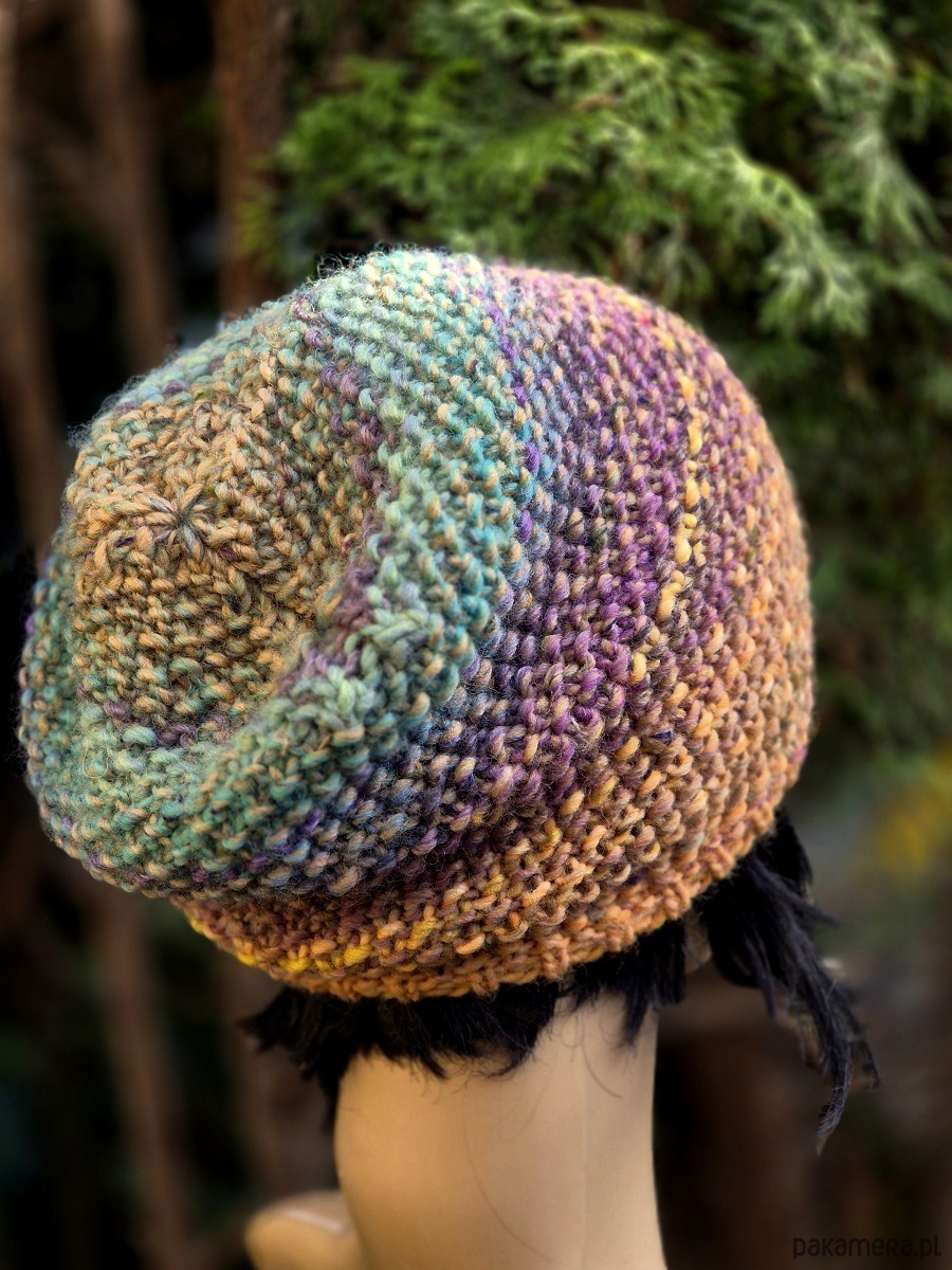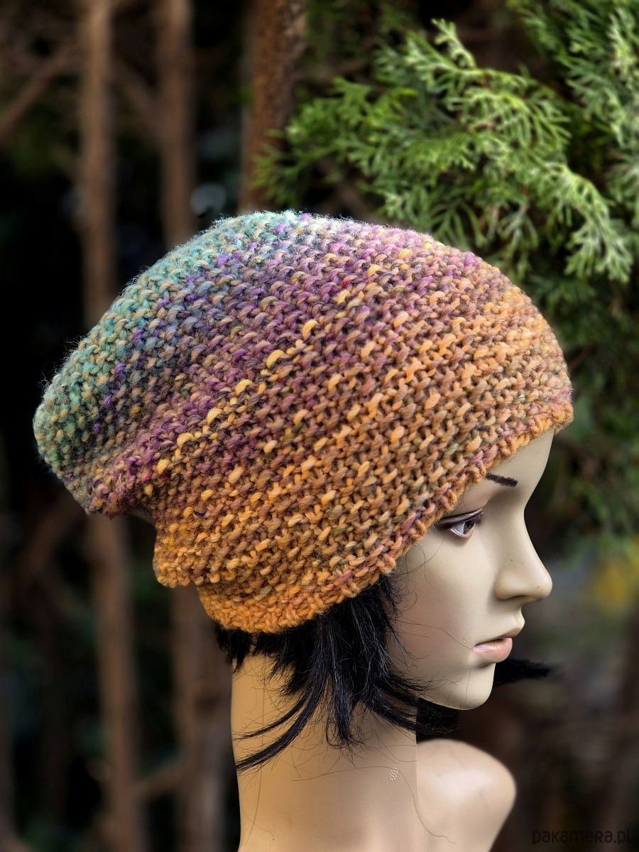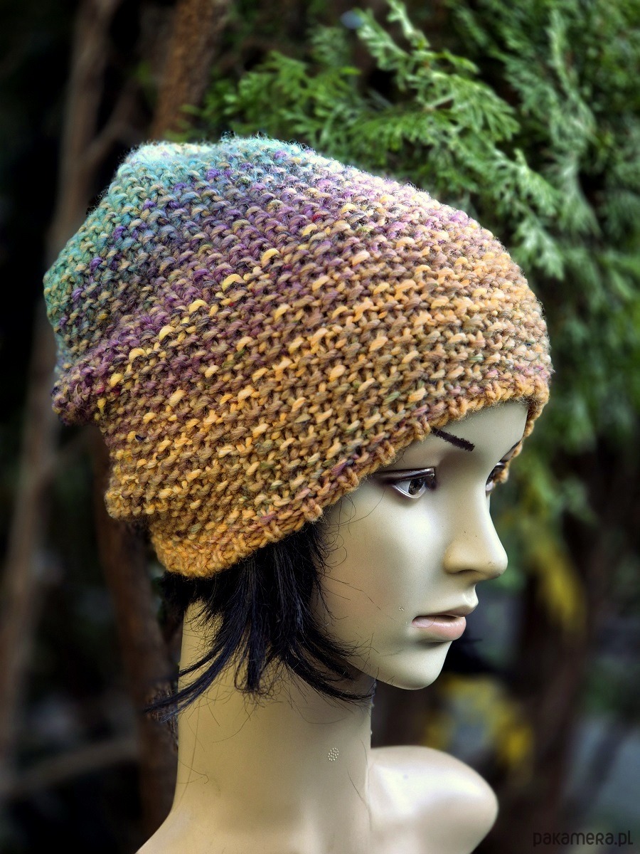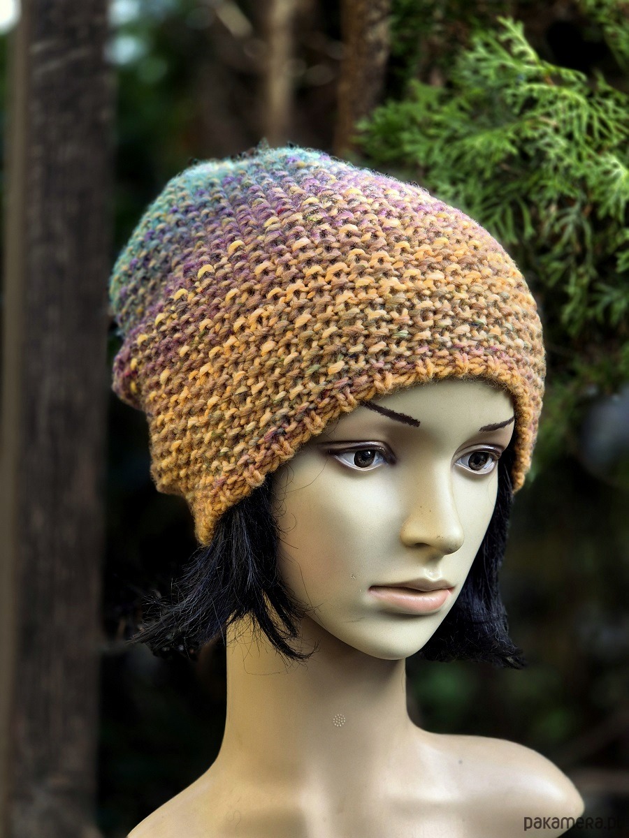 Ciepła i miękka czapa wykonana ręcznie na drutach z hiszpańskich włóczek w pięknym zestawieniu kolorystycznym (53% wełna, 47% akryl), przyjemna w dotyku. Czapka jest bezszwowa.