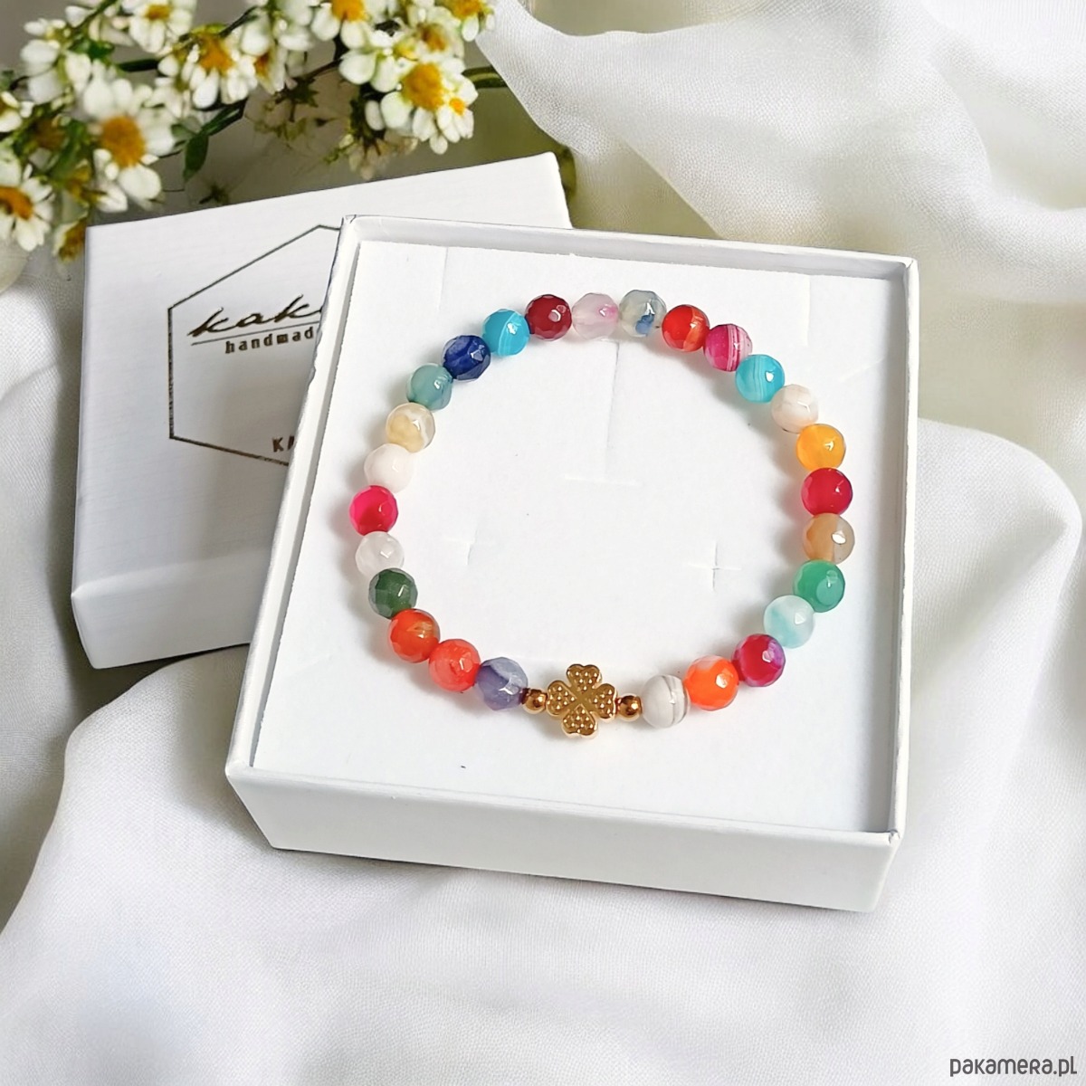śliczna bransoletka na solidnej lince elastycznej, wykonana z fasetowanego, wielobarwnego agatu 6mm oraz przekładek i koniczynki ze złotego hematytu.